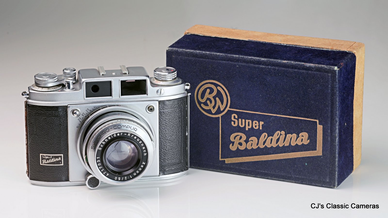 A later Baldina from around 1957 with coupled rangefinder and Schneider-Kreuznach 50mm f/2.8 Radionar lens in Compur-Rapid shutter. By this time the prefix 'Super' had been dropped, but it was otherwise very similar to the earlier example above.