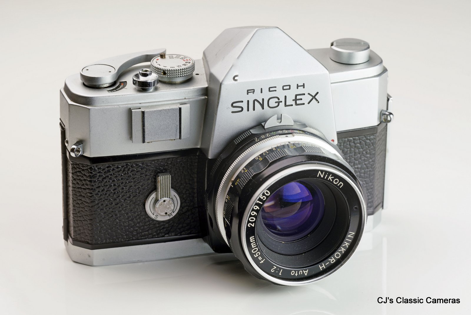 The Ricoh Singlex was a rather unusual camera for reasons that wouldn't be immediately obvious, particularly if its original Ricoh lens was mounted. It was Ricoh's first SLR with interchangeable lens mount, but only upon very close inspection would one realise that that lens mount was in fact a Nikon mount! The Singlex was indeed a copy of the Nikon Nikkorex F, which in itself was already an unusual Nikon, as it was actually by Mamiya. The Singlex came with its own standard lens, the Rikenon 58 mm f/1.4, but apparently that lens does actually not mount on Nikon cameras, as there was a small difference between the mounts (but most Nikons will mount on the Singlex). The Singlex also featured a metal Copal shutter with vertical blades, which was first introduced on the Nikkorex F and which was a great advance in reliability. All in all the Singlex still is a pretty impressive camera, and generally cheap, so a great option if you have some old Nikon glass.