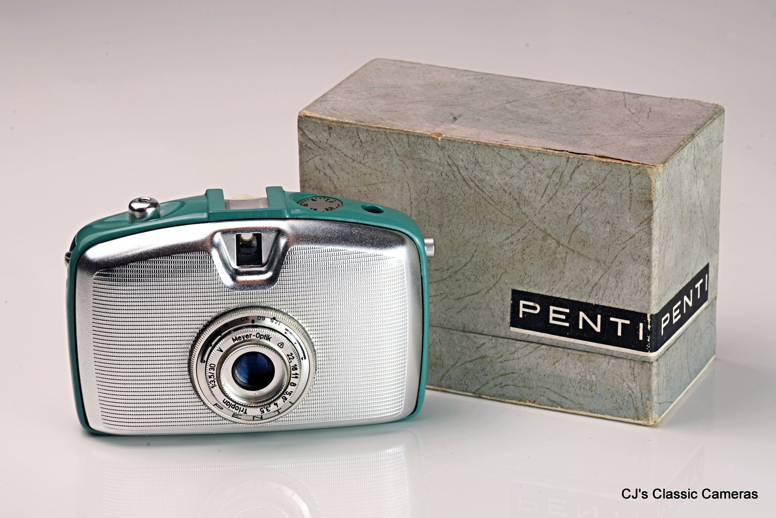 The Penti II appears to be an attempt to give the camera a more distuinguisged look, and also added a coupled lightmeter, projected in the viewfinder, and a more easy to use focussing tab. It was still available in a range of colours and was also briefly produced in silver colour. I had a similar plunger-driven film transport as the first Penti. There was also a Penti I, which lacked a lightmeter.