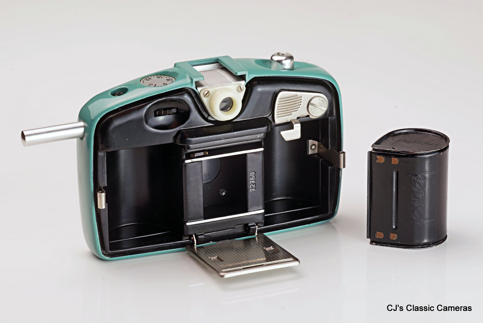 Rear view of the Penti with back removed and film pressure plate down. Also shown is an SL cassette, which is similar to a Rapid cassette but was made from plastic instead of metal and lacked an ISO setting tab. Therefore the Penti had an ISO adjustment (lever just about visible on the front view photo above), unlike most other 'Rapid' style cameras.