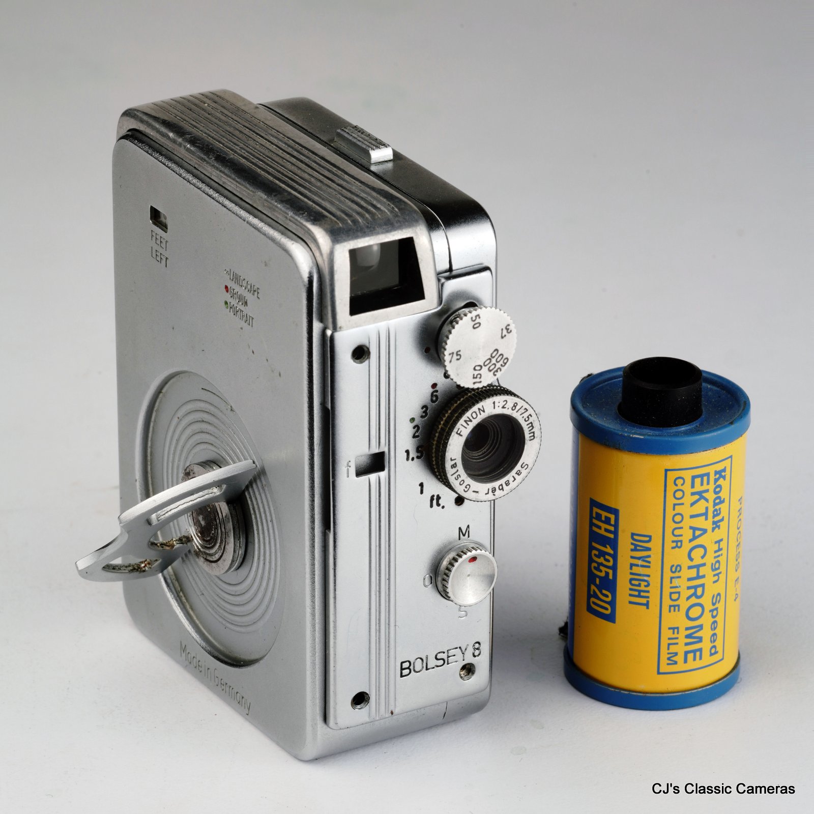 Bolsey 8 with Saraber-Goslar FINON lens and marked 'Made in Germany'. The speed dial is also very recognisable, being very similar to the one of the Finetta 99L above. Unfortunately this example is missing its aperture dial. A 35mm film cassette is included to illustrate the small size of this film camera, although of course this camera did not use this film format.