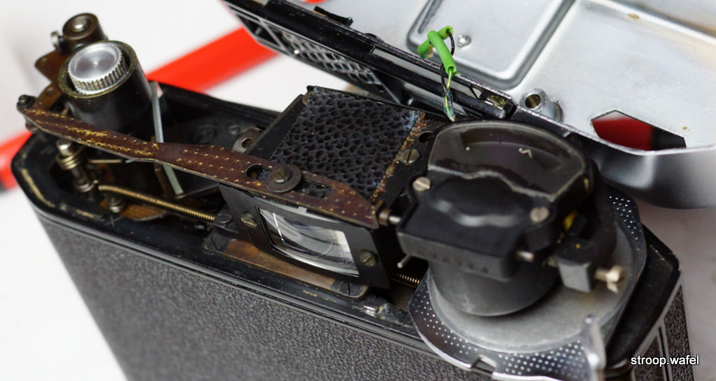 Close-up of the lever mechanism that transfers the exposure settings to the light meter (seen from the back of the camera). Also visible is the very long spring pulling the rapid winder and the rangefinder. The latter can be adjusted through a hole in the top housing which can be accessed by removing the accessory shoe. A small hole in the side of the camera allowed adjustment of the coupled lightmeter.