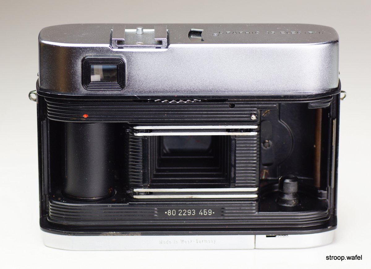 Also note the open battery compartment. The camera took 2 AA batteries and according the manual these would last about a 1000 exposures. Obviously without them the camera will not work at all. Unfortunately many Iloca/Graphic 35 Electric have been damaged by leakage from empty batteries that have been left in the camera.