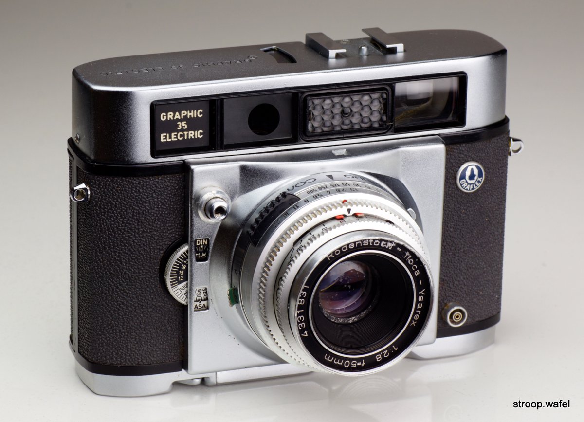 An Iloca Electric rebranded Graphic 35 Electric and sold by Graflex in the U.S. This example is from the fourth quarter of 1959 and features an interchangeable Rodenstock-Iloca-Ysarex 50mm f/2.8 lens, which has seen better days. There were some small differences with the Iloca version, the most obvious ones the presence of strap lugs and the little Graflex emblem on the front. The insides of the cameras also show some small differences, but most likely these were just small improvements made during production of both models.