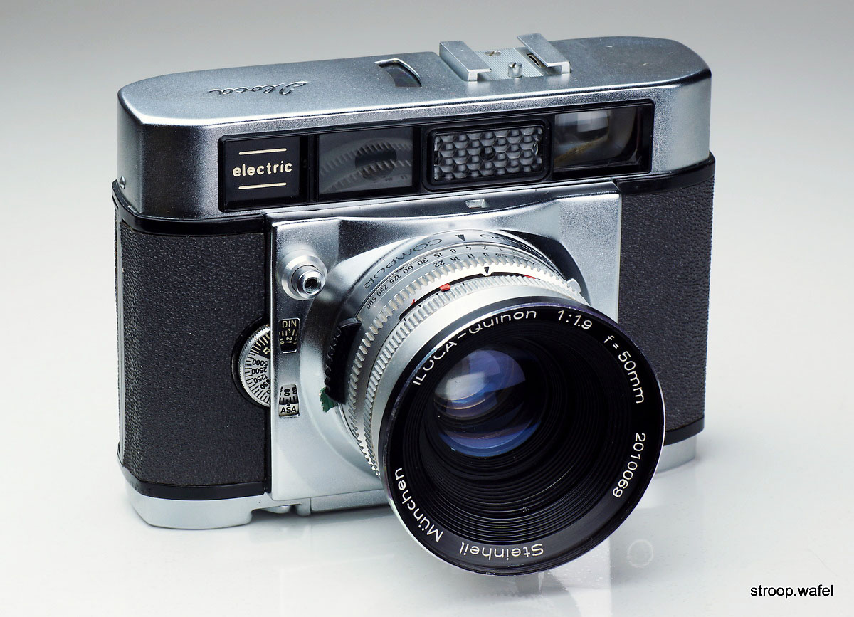 An Iloca Electric made in the second quarter of 1959 with interchangeable Iloca-Quinon 50mm f/1.9 by Steinheil. Quinons are mostly known in Exakta and m42 mount, the only other rangefinder Quinon I am aware of was the one made for the King Regula Super range, but the latter was mounted in a Prontor shutter whereas the Iloca has the more common Compur Deckel mount. Other cameras from that era with the same mount used different brands for their fast lenses (e.g., Schneider Xenons on the Kodak Retina IIIS and Reflex S, III and IV, Balda Baldamatic III and Edixa Electronica; Enna Ennalyt on the Braun Super III). A fast Rodenstock Heligon 50/1.9 was also avaible for the Iloca Electric.