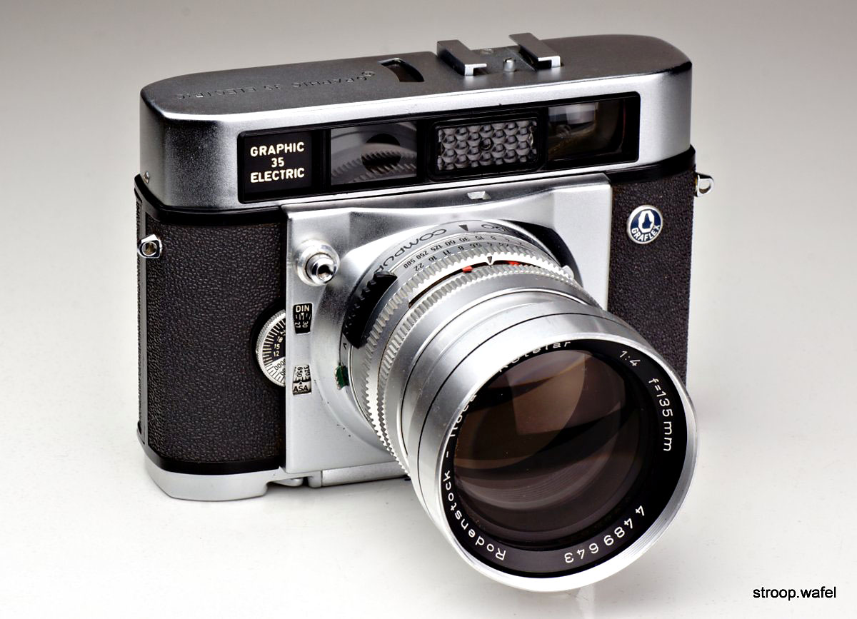 Graphic 35 Electric with Rodenstock-Iloca-Rotelar 135mm f/4 lens mounted.