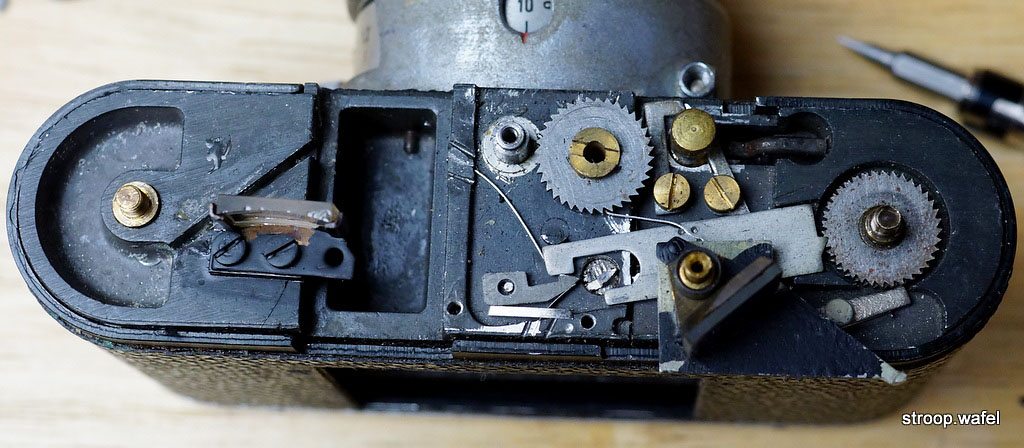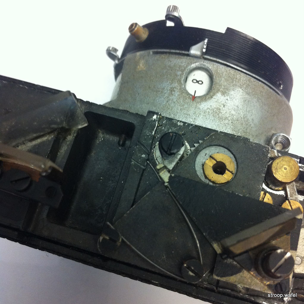 Inside mechanism of an Iloca IIa. In principle not that different from the Iloca Ia. Note that the rangefinder mirror has been swung out of the way to expose the mechanism underneath. The semi-transparent mirror was removed for recoating.
