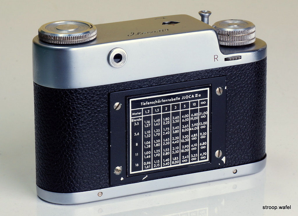 The backside of the Iloca IIa with depth of field table in German. One of the advantages is that one can unscrew this for access to the inside of the camera, for instance in case there is a problem with film loading or if one wants to check the focus accuracy.