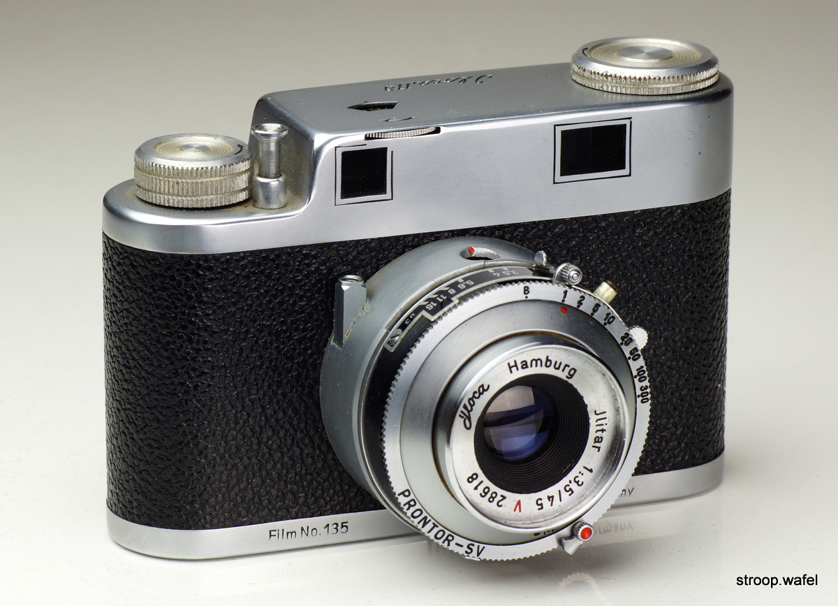 The second incarnation of the Iloca IIa had a silver-coloured lens instead of the black one of earlier versions. Nearly all had Prontor-SV shutters and a single red dot as speed indicator. Many of these appear to have had he markings 'Made for Navy service' on the bottom plate.