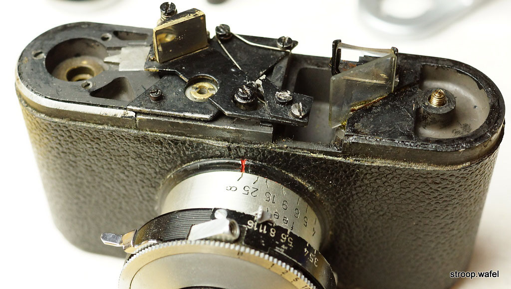 Rangefinder mechanism of an Iloca II. It is slightly different from the Iloca IIa, here there's an extra metal bit with two screws. The rangefinder can be adjusted by fiddling with these two screws, again a job that requires a lot of patience, and the thread of the screw holes is easily damaged, leaving a wobbly rangefinder... Note again the poor condition of the semi-transparent mirror (on the right). Some Iloca IIs had a little adjustment screw on each mirror so it was easier to correct horizontal and vertical offsets. I am not sure why Iloca abandoned that option later.