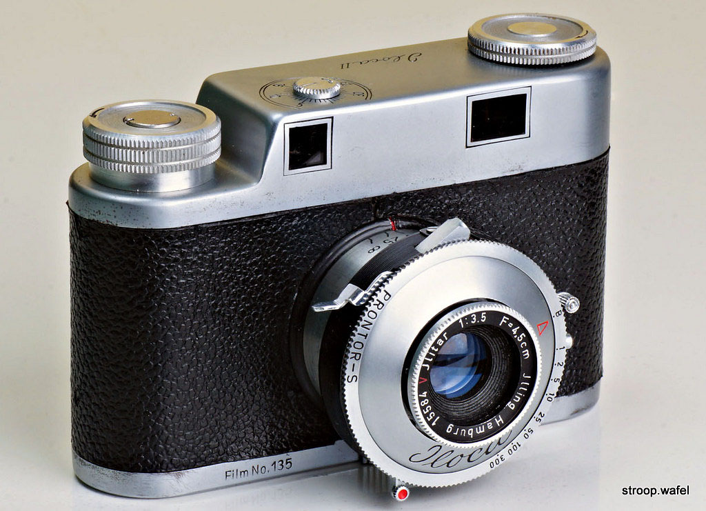 The Iloca II was introduced around 1950 as the rangefinder version of the Iloca I v.2. It featured a coupled rangefinder and helical focusing. Like on the Iloca I, the shutter release was located on the shutter itself and the shutter had to be cocked by hand. The wind lock mechanism was also the same as on the Iloca I: after taking a picture one had to push down the wind knob to reset the wind lock, after which one could wind the film for the next exposure.