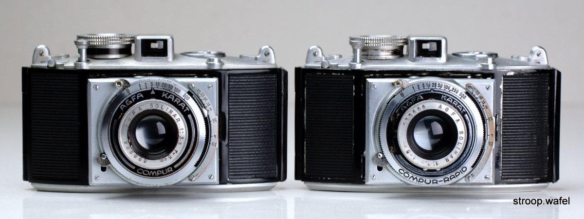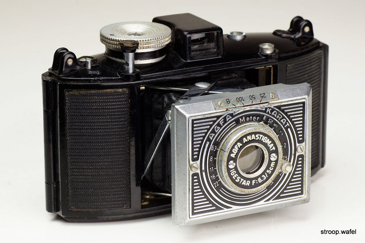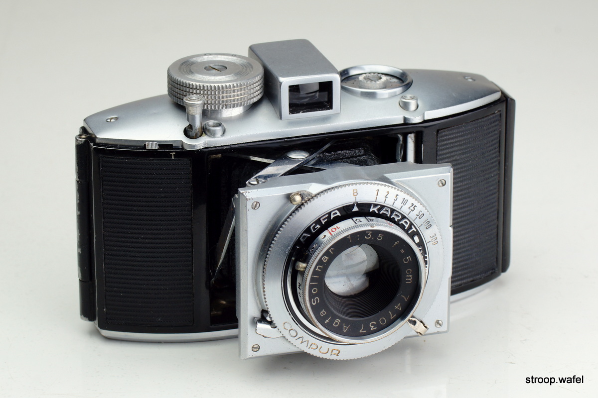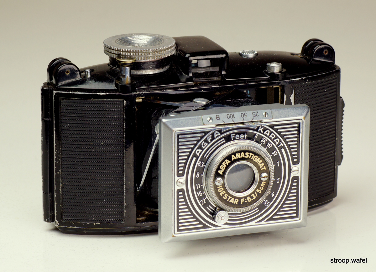 The Agfa Karat 6.3 to 3.5 were a range of small strutfolding cameras with a very distinctive design that used the Karat cassette system. The model numbers stood for the maximum aperture of the lens. Although it is tempting to think that the Karat 6.3 was first, followed by the 4.5 and then the 3.5, this was actually not the case. The Karat 6.3 Art Deco certainly was the first Karat, but the next model was the Karat 3.5 was next. The 4.5 and 6.3 were introduced soon after and were in production simultaneously with the Karat 3.5. All versions received small updates during their production. After WWII only the Karat 3.5 was still produced for some time. The models and their variants are presented here roughly in chronological order.