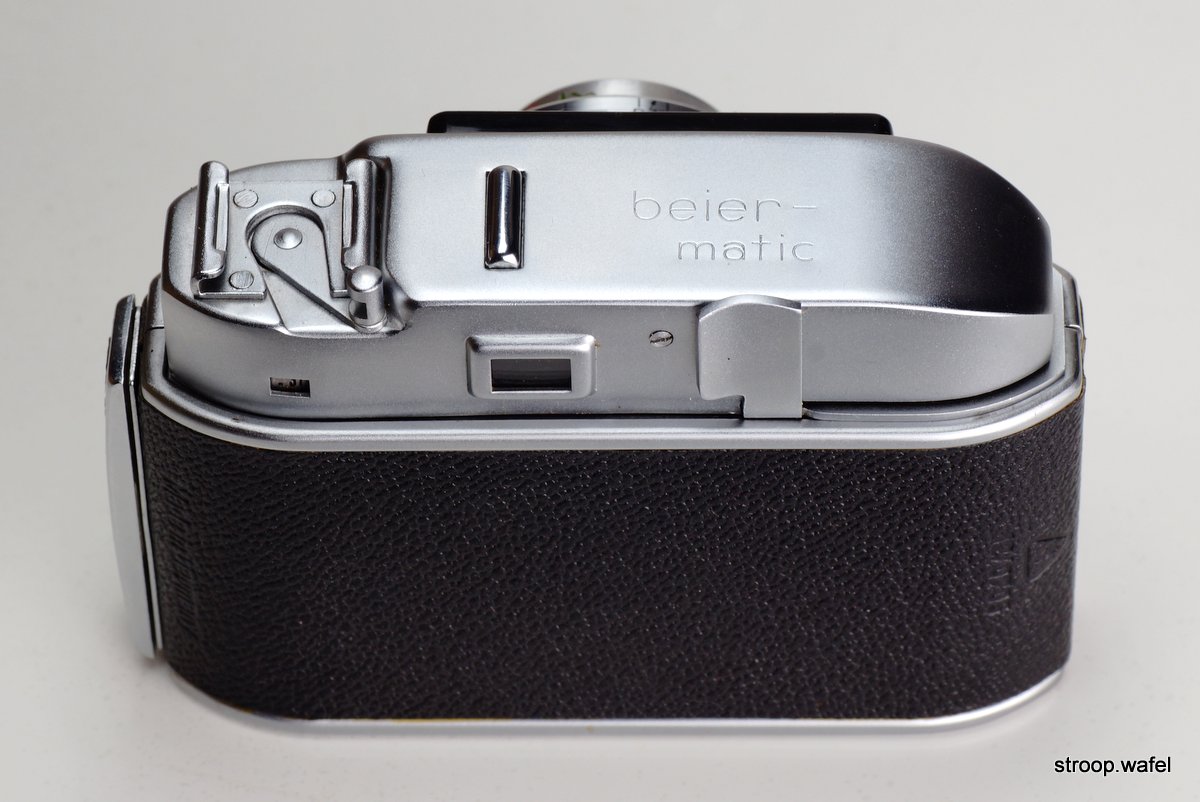 The Beier-matic was a more modern looking version of the Beirette and included a lightmeter, semi-automatic exposure and a bright-frame viewfinder. Not much info can be found about this model, but it was introduced around 1961. A curious feature was the rewind lever, which was integrated in the accessory shoe. As far as I am aware this was the only Beirette 35mm camera with lightmeter.