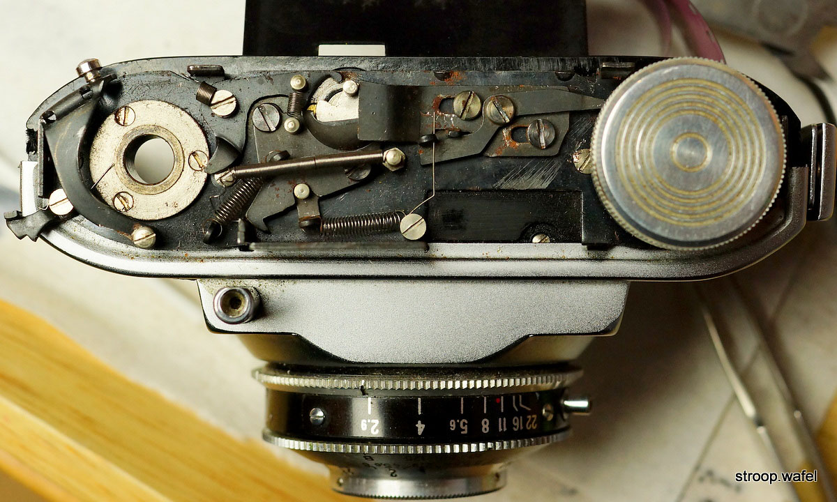 A Beirette K with Ludwig Meritar 45mm f/2.9 lens in a shutter marked 'Modell II'. The original grub screws had been replaced by rather oversized versions, but well, at least it makes focussing easier. As can be seen below, the camera had also been robbed of its frame around the rear eye piece as well as the frame counter, unfortunately I had not paid enough attention to the photos of this camera before deciding to buy it. On top of that the shutter does not work despite the camera being described as fully working. Not the first time, Rocky.