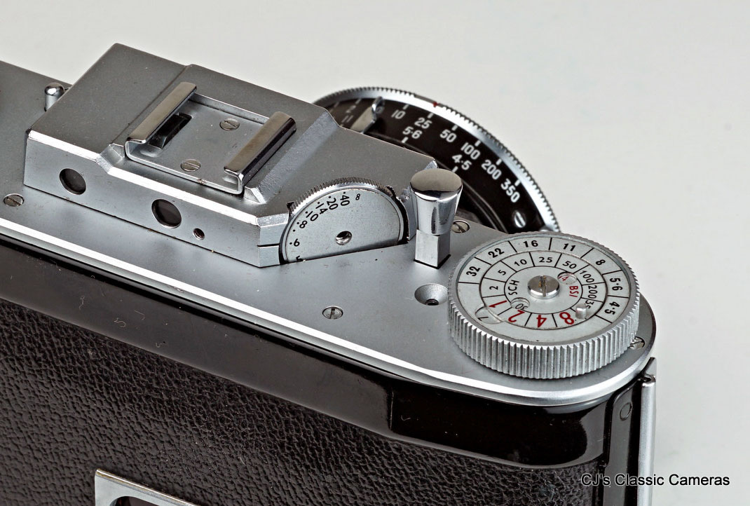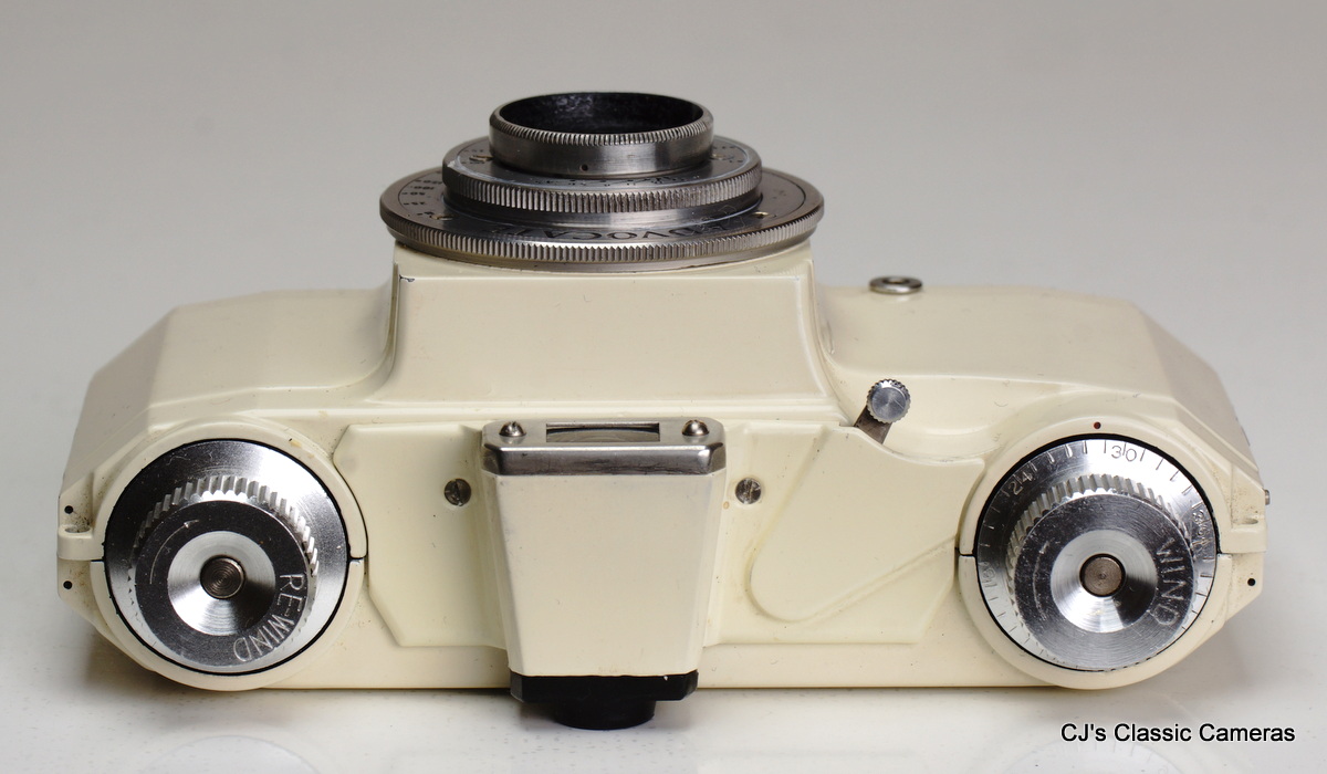 Top view of the Wrayflex Ib showing its clutterfree top deck with frame counter, shutter speed selector and rewind key. Also note the characteristic tapered body shape and off-centre lens mount, a little unusual for SLRs.