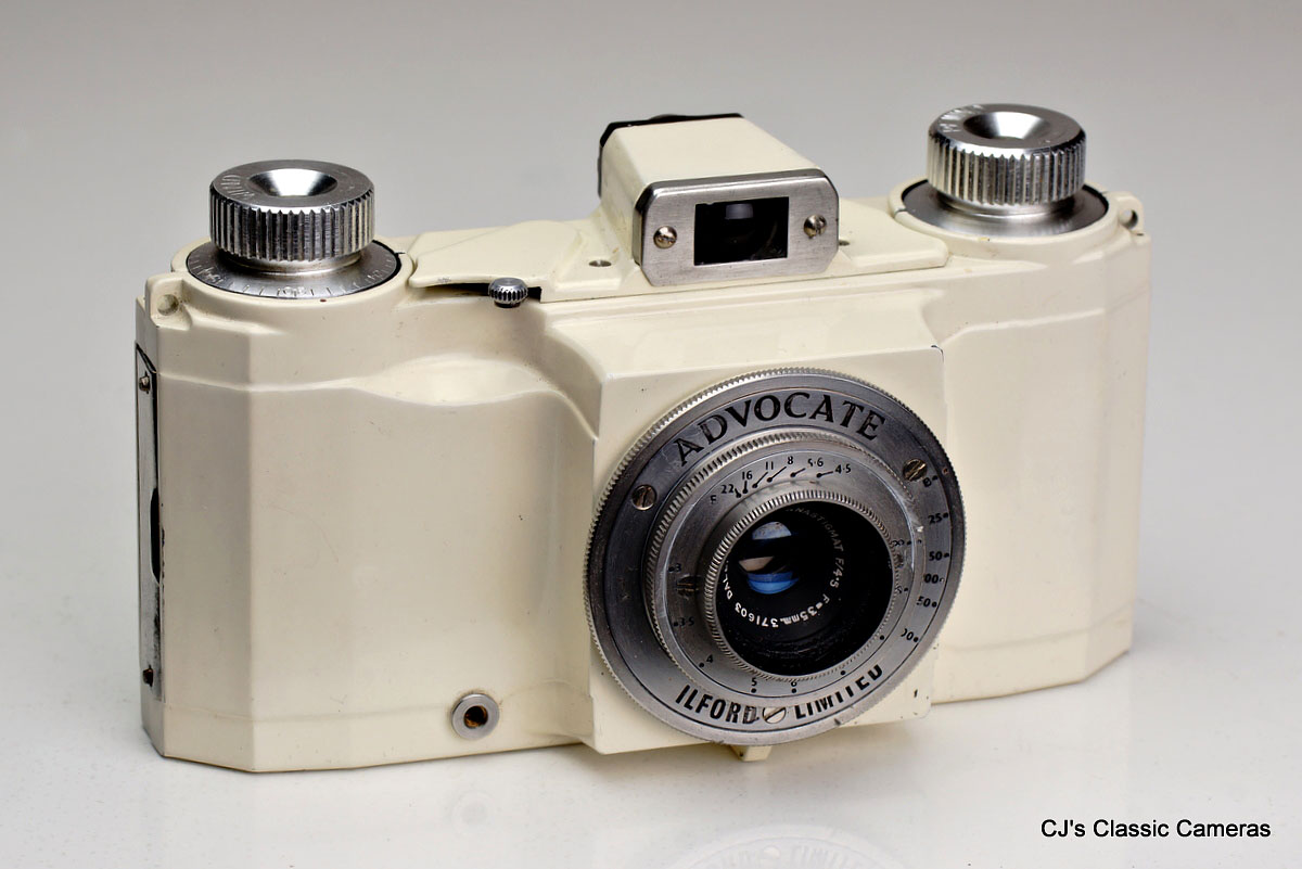 In any case, the Advocate was quite an usual camera in two aspects. First of all, it was painted in an ivory enamel colour, which was quite a change from the dominantly black and chrome of other cameras from that era. Second, it had a coated four-element 35mm lens, instead of the more common 45 or 50mm lenses on other cameras. I think this is quite an underappreciated feature of the Advocate, as wide-angle lenses were quite rare at the time, certainly amongst amateur photographers. It wasn't until about 10 years later that other, mostly Japanese, manufacturers starter offering 'wide' versions of several cameras. But even though it is mentioned in ads from the time, Ilford didn't make much noise about this feature. This despite the fact that the lenses (made by Dallmeyer, although on some of the later production a Wray Lustrar can be found) must have been expensive to produce, especially since they were dedicated to one camera and produced in small numbers, and this would have driven up the price of the camera.
