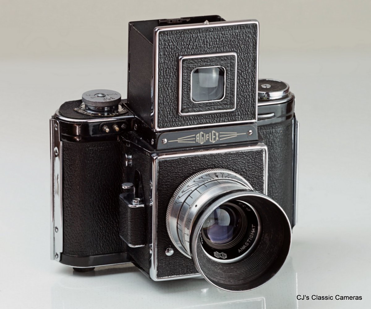 The Agiflex was a large 6x6 medium format reflex camera that was a very close copy of the German Kochmann Reflex Korelle. However, it was somewhat larger and heavier. It was introduced just after WWII as the production version of a similar model that Agilux had developed during WWII for military use. The camera had a focal plane shutter and an interchangeable lens mount, and was operated using a wind lever. The latter often caused problems, as it cocked the shutter using a long string which can break or become detached. However, it is possible to cock the shutter using the speed knob and the wind lever will still forward the film, so I think it could still be used with a broken string, but have not actually tried this out.