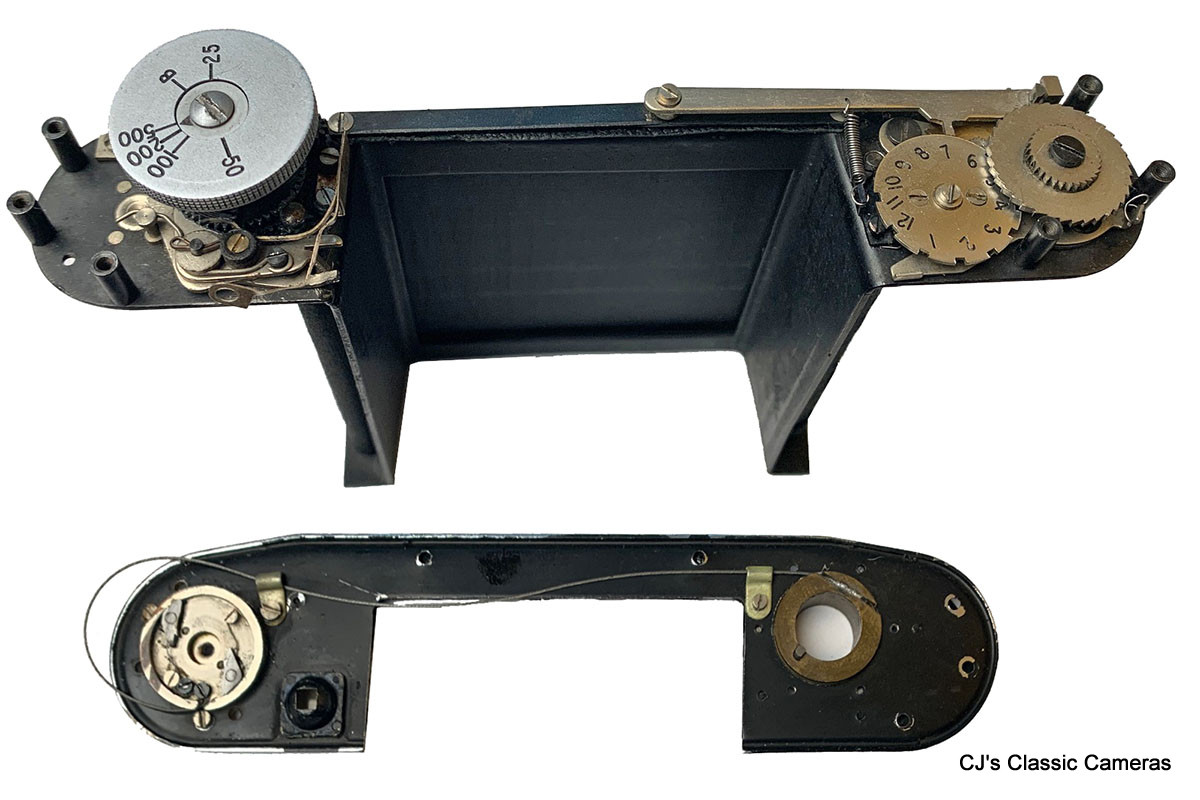 Shutter taken out of the camera, showing the film advance and frame counter on the right, the speed mechansim on the left (I remounted the shutter speed dial after taking the shutter out of the camera body). Also shown is the top plate, which is upside down and shows the wire connecting the wind lever to the shutter speed dial, which cocks the shutter when turned.