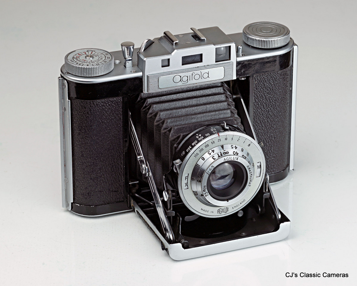 The Agifold was Agilux's small range of 6x6 medium format folding cameras for 120 rollfilm. It was first introduced in 1948 and this first model was a relatively simple folding camera with one special feature, a small top-view viewfinder. The Agifold II had an additional extinction meter (a special type of lightmeter) as well as uncoupled rangefinder. The Agifold III was mostly a cosmetic upgrade to a much more modern-looking camera.