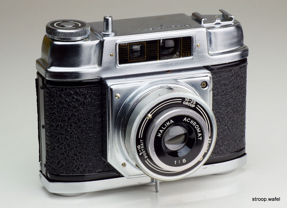 Another simple little camera from Halina, this one from ca. 1962. It was a 120 rollfilm camera with a fairly unique feature of dual format capability, which would make 16 4x4 or 12 6x6 photos on one film. It therefore featured two viewfinder windows. The different formats were achieved by a mask in front of the film gate, so the format could not easily be changed after loading the film. It had a curved film frame like the Coronet Viscount. It had a fixed shutter speed of 1/50s with 3 aperture settings (f/8, f/11 and f/16).