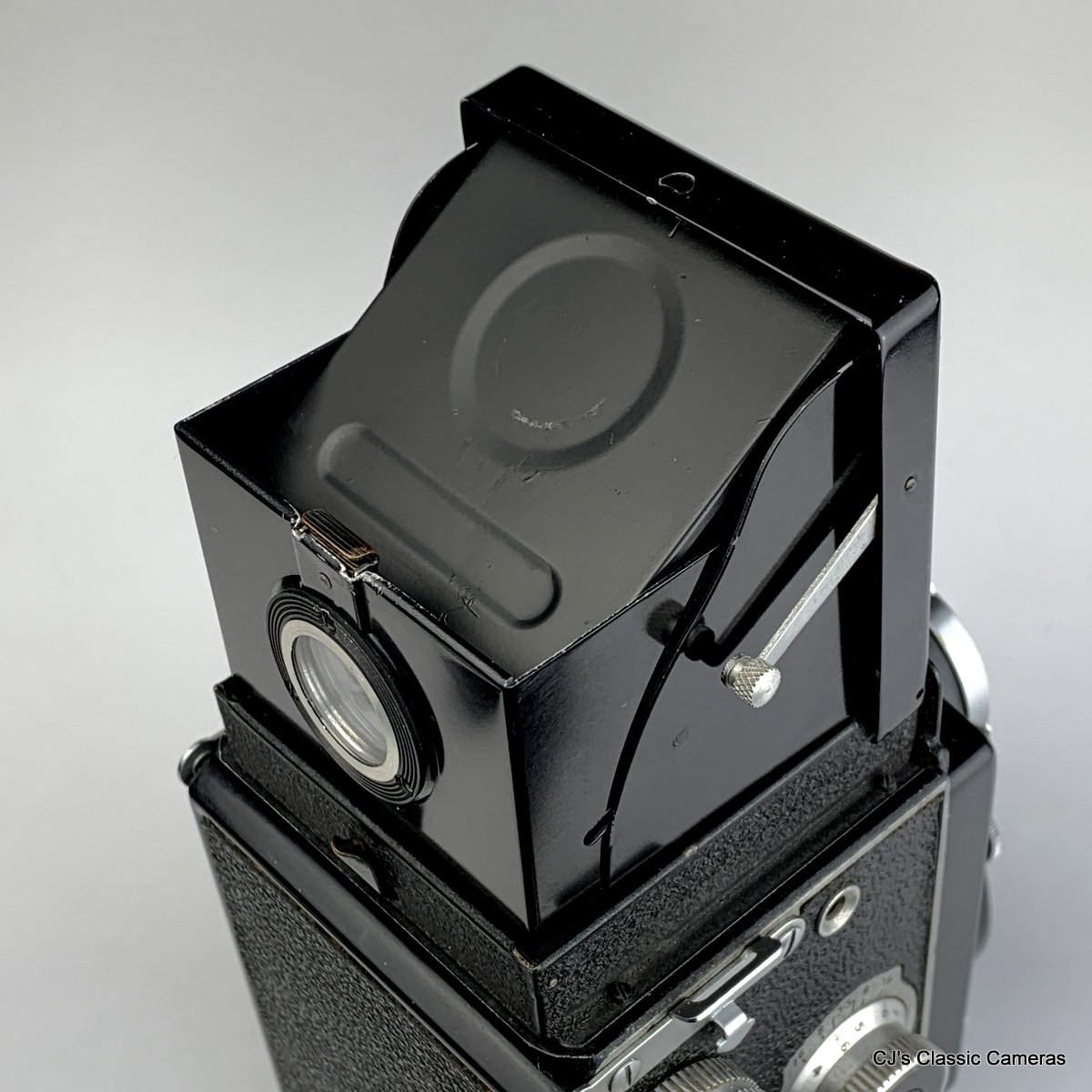 A rather basic folding camera, certainly compared to earlier Kershaw folders such as the Peregrine, but nevertheless decently made. It looked rather cheap with a top cover of dull aluminium and plastic covering with a woven texture. Probably its most distinguishing feature was the shutter release: a small latch on the side of the lens base. It was produced around 1955 and made 12 6x6cm photos on 120 rollfilm.