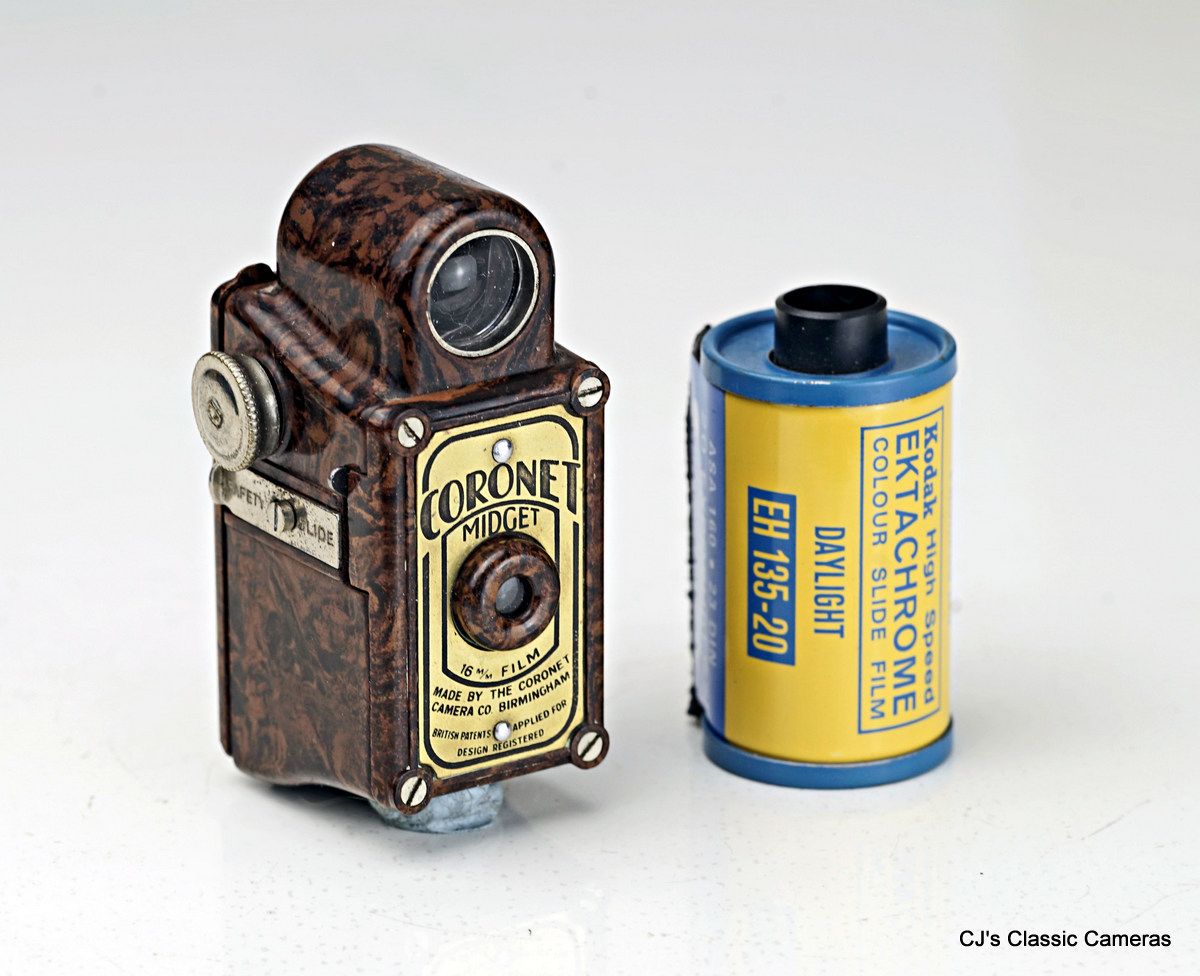 A Coronet Midget next to a 35 mm film canister to show its diminutive size. It was of course too small to use this film, it used 16 mm rollfilm instead.