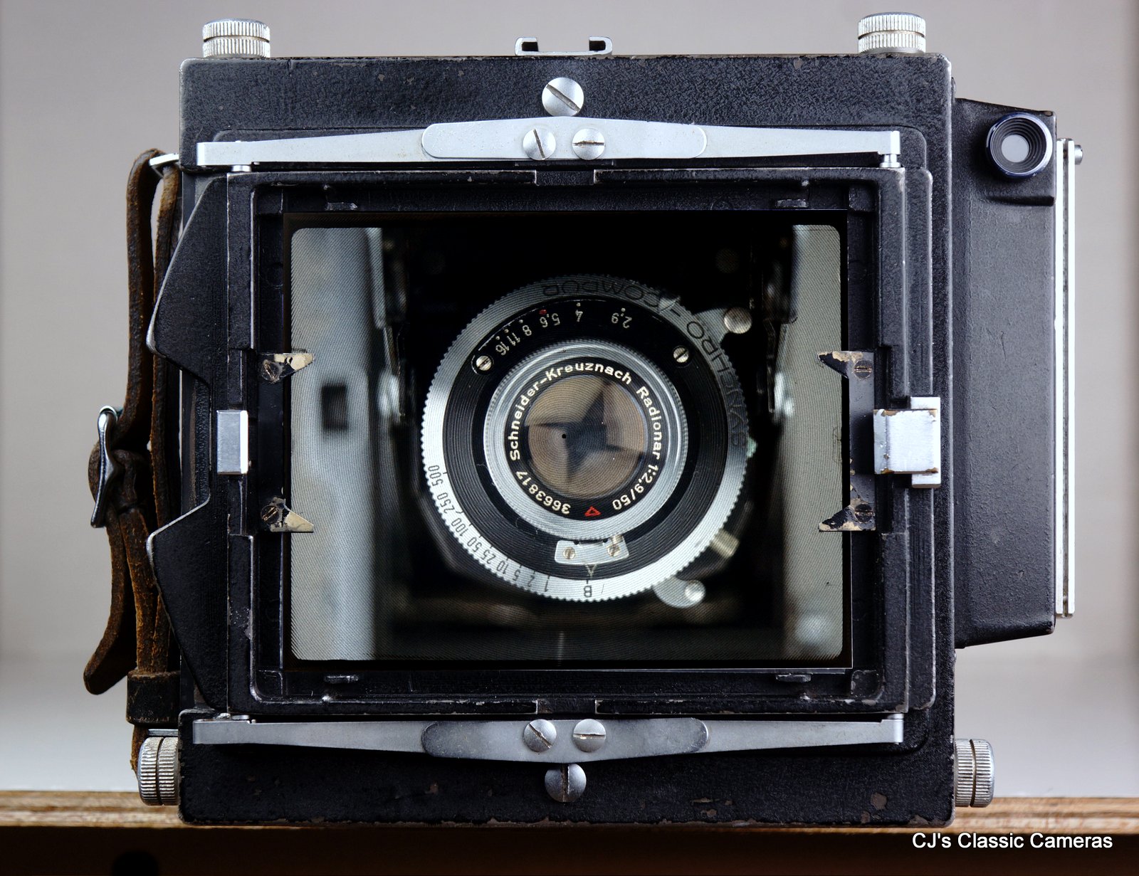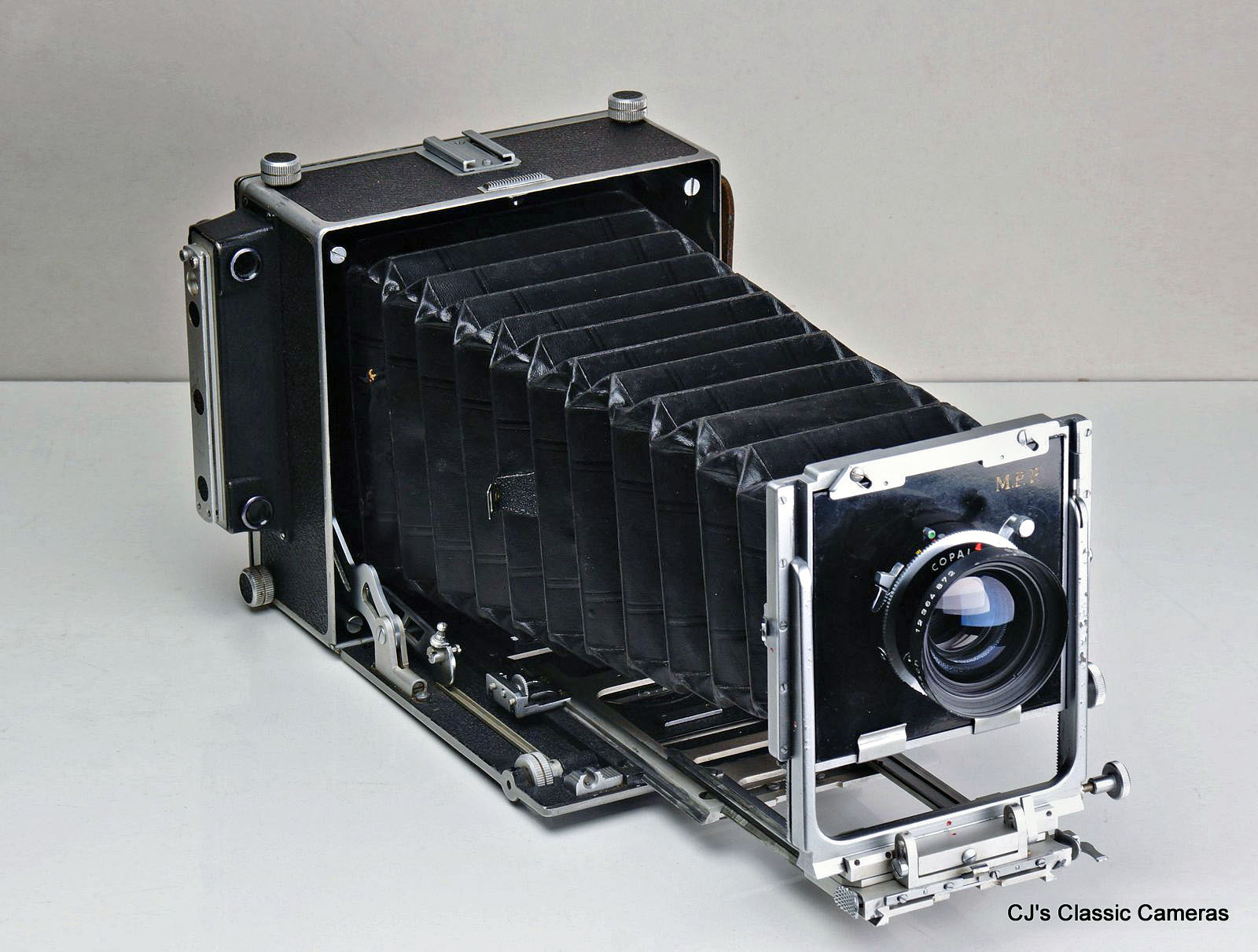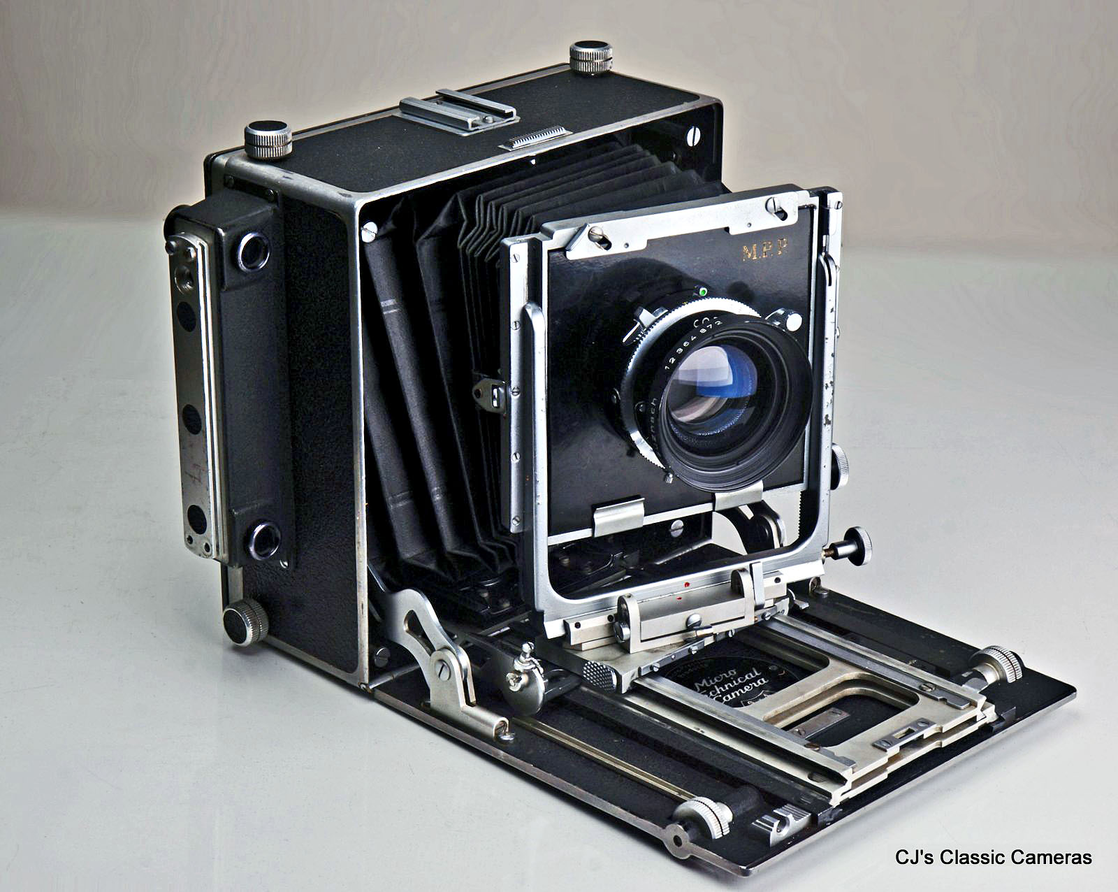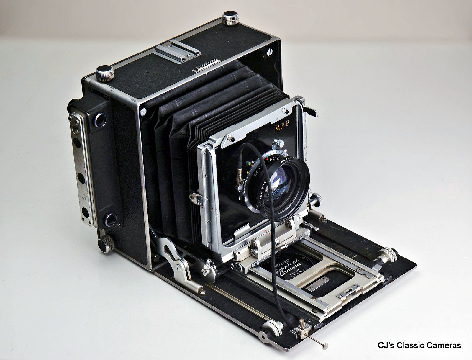 MPP Micro Technical Camera with Schneider Symmar-S 150mm f/5.6 lens (a standard focal length for this format) in Copal No. 0 shutter. This example is a late Mark VI from around 1955. Note the rangefinder unit to the left of the body.