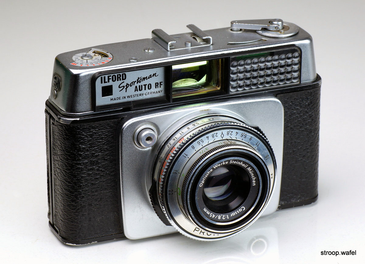 Not really made in Britain but in Western Germany by Dacora, as indicated on the top housing. However, it was branded Ilford and sold as such. Dacora made many cameras for Ilford, including the Sporti and Sportsman range. The 1962 Sportsman Auto RF was one of the most highly specified models of the Sportsman range. It featured a coupled rangefinder as well as a coupled (not really automatic) light meter. The equivalent Dacora model was the Dignette E-B (German for rangefinder and light meter: Entfernungsmesser - Belichtungsmesser).
