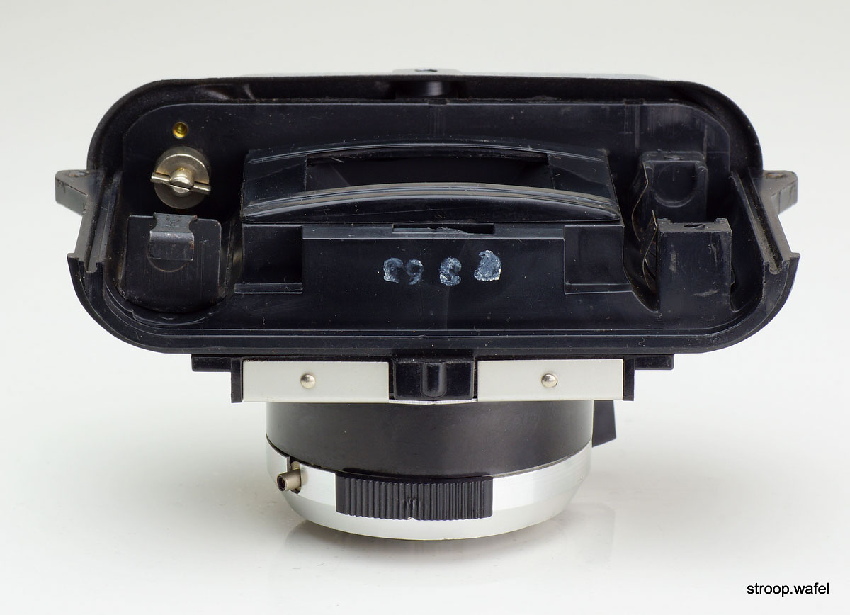 Top view of the MPP Microcord with open hood showing in eye level viewfinder mode. In this mode a mirror would be flipped up (not visible in the photo) and one would look through the eye piece at the back of the hood. This allowed one to have the camera at eye level instead of at waist height whilst still observing the scene through the viewing lens. This model of hood was only available on the Microcord Mark I. For the Mark II it was replaced with a direct viewfinder mode (no mirror, just the hood's frame). Perhaps due to patent infringement? As also this feature was copied more or less without change from the Rolleicord.