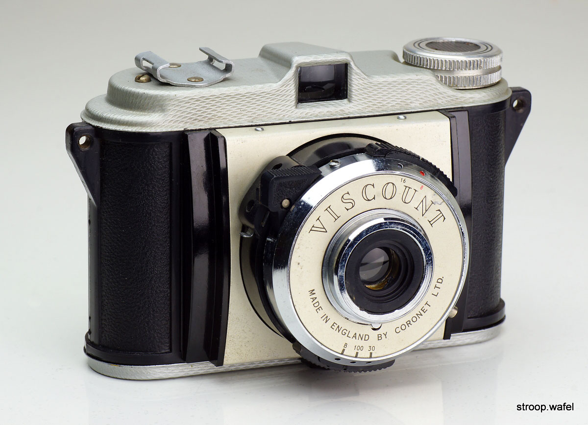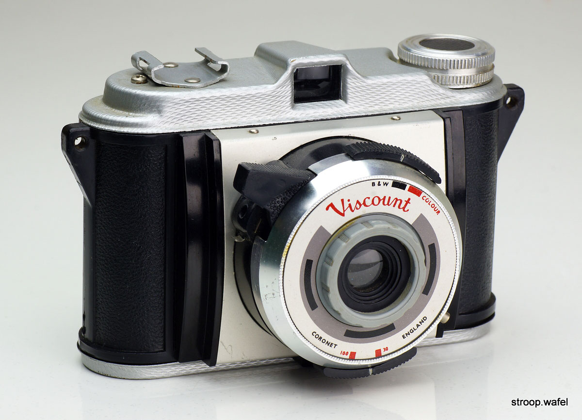 The Coronet Viscount was built from 1957 by Coronet in Birmingham, UK. It was a roll film camera that produced eight 40x27mm pictures on 828 film. It had simple controls, one had a pick of two apertures, f/8 and f/16, and two shutter speeds, 1/30s and 1/100s plus B. It had a self-cocking shutter. A second version (around 1961) missed the B setting and the aperture settings were replaced with a B&W or colour switch. They had fixed focus lenses. The camera was mostly made out of plastic and light-weight metal, but feels nonetheless pretty robust.