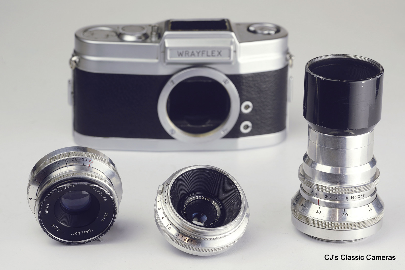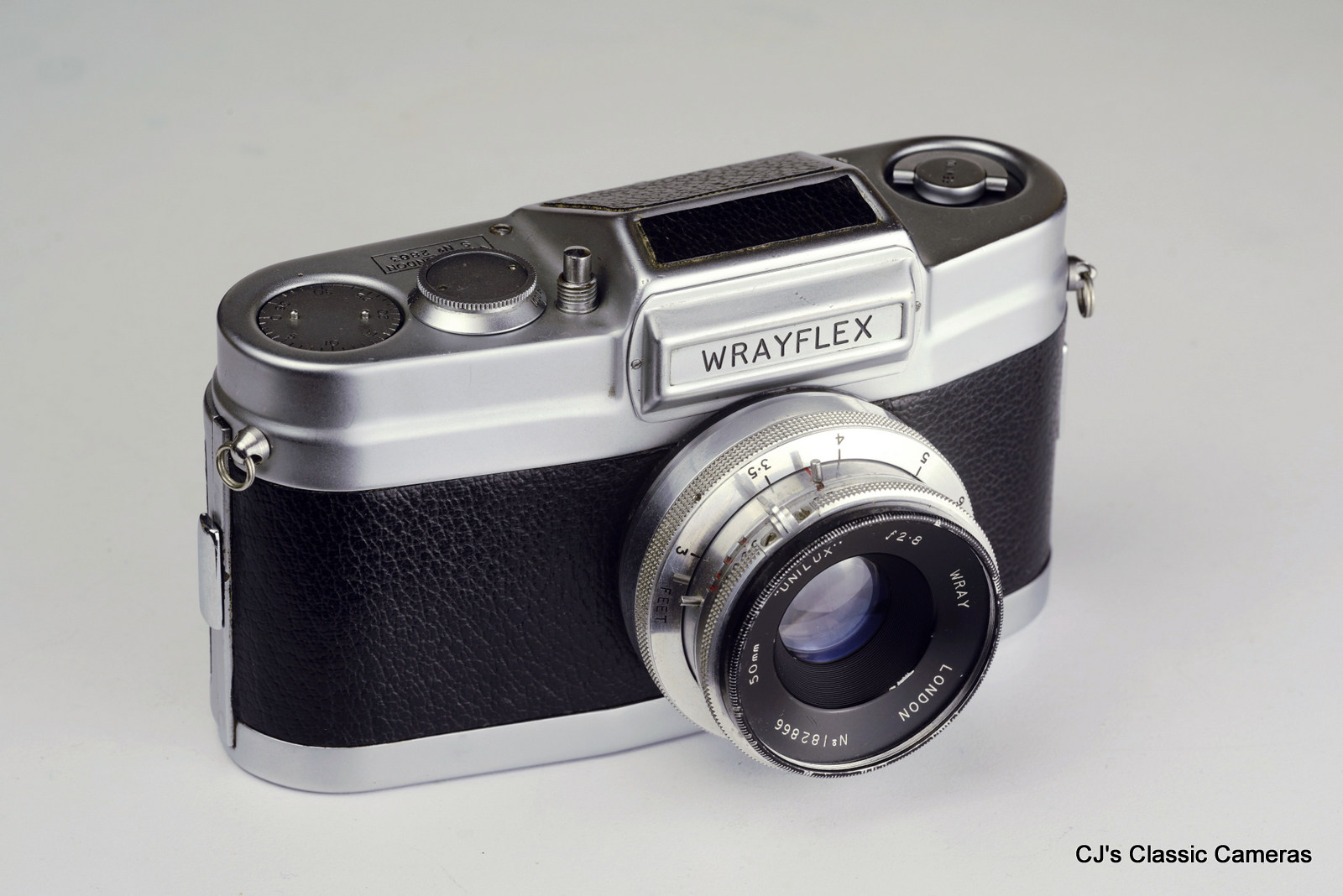 Wray London was a company founded in the mid 1850s making optical items such as binoculars and lenses. Its lenses had a good reputation and were amongst other used on e.g., the Ilford Advocate. Around WWII the company must have decided to try their hand at building cameras, with their main effort being the Wrayflex. This ended up being the only British-made SLR camera (!), but unfortunately it wasn't very successful. The first model didn't have a pentaprism, instead it projected the lens image into the viewfinder with a set of mirrors which meant the image was mirrored and somewhat dim. The Wrayflex II did have a pentaprism, which was a significant improved in functionality, but it made the camera rather awkward looking. As one would expect for an optical company, the Wrayflex did come with a good set of interchangeable lenses, but this wasn't enough to make up for its other flaws. A shame really, as I find it a very likelable camera, especially the first model, despite it somewhat inferior viewfinder.