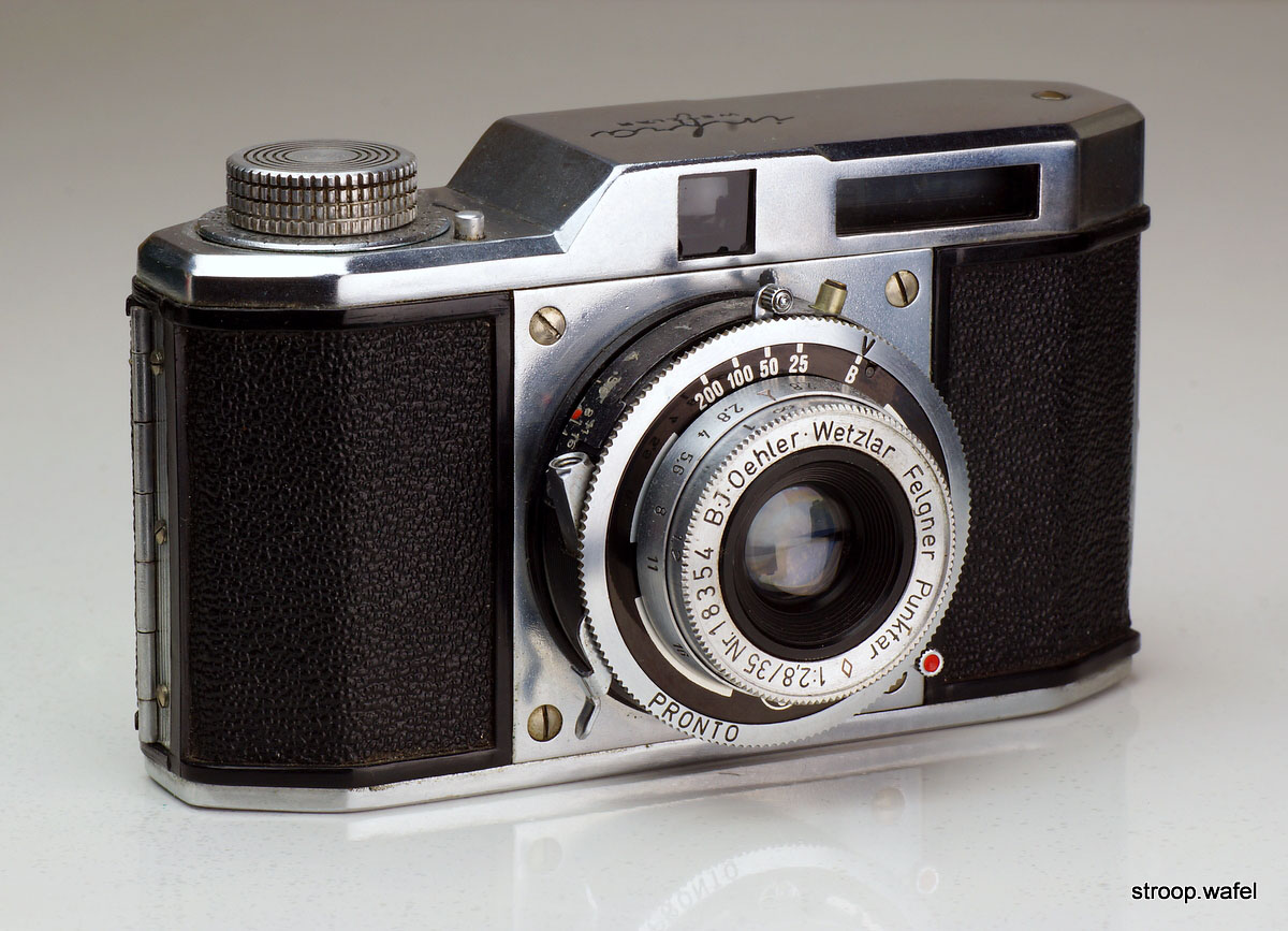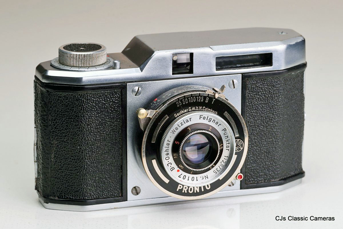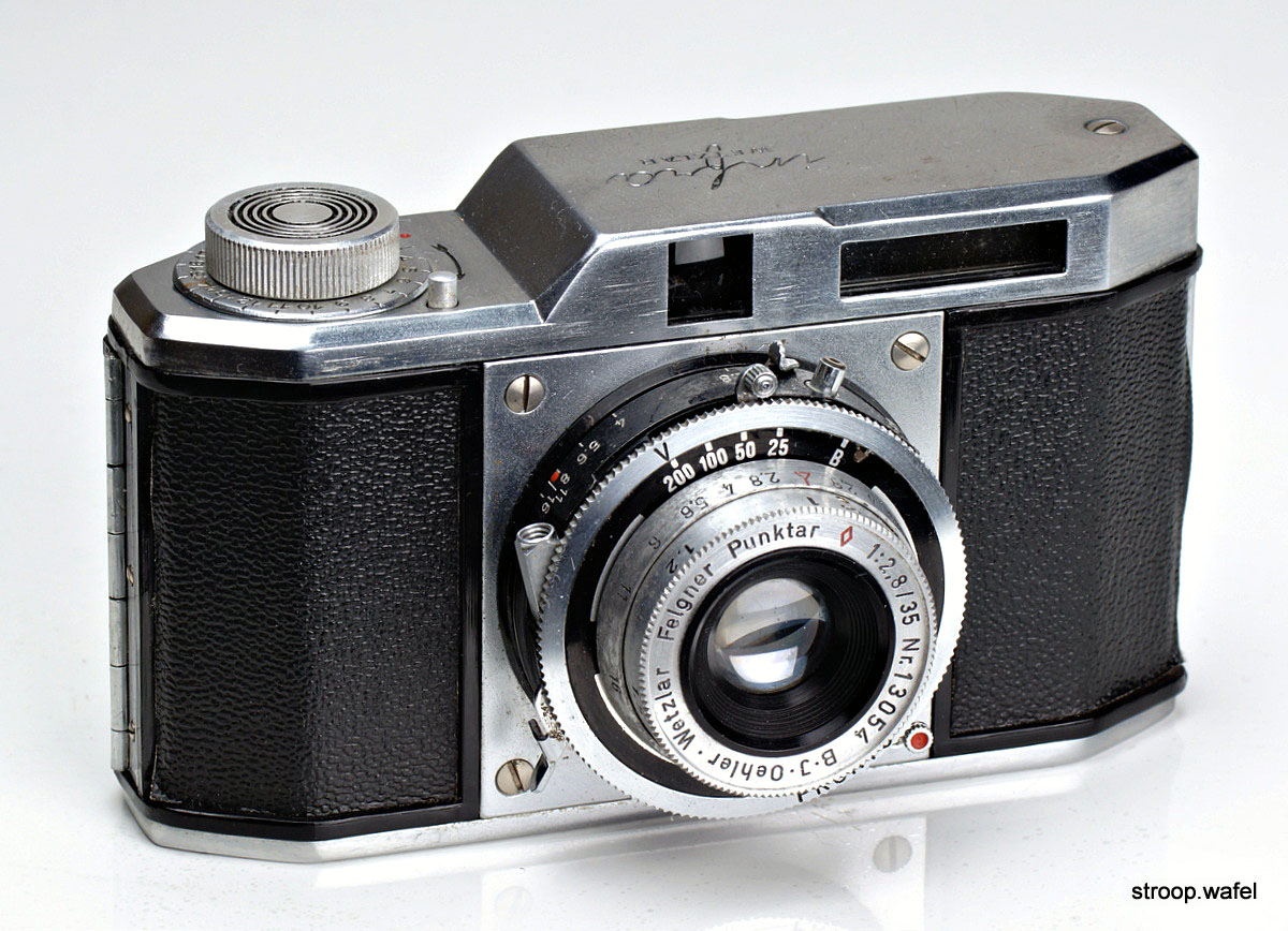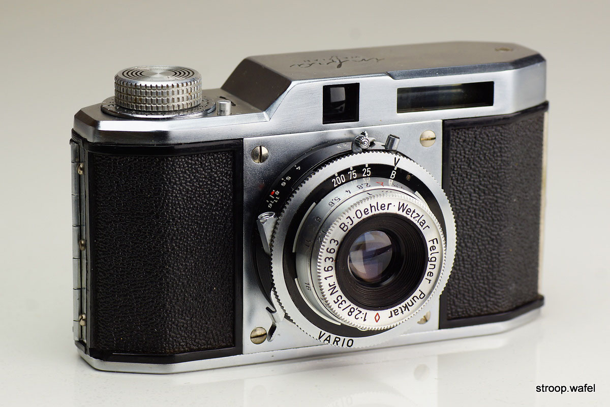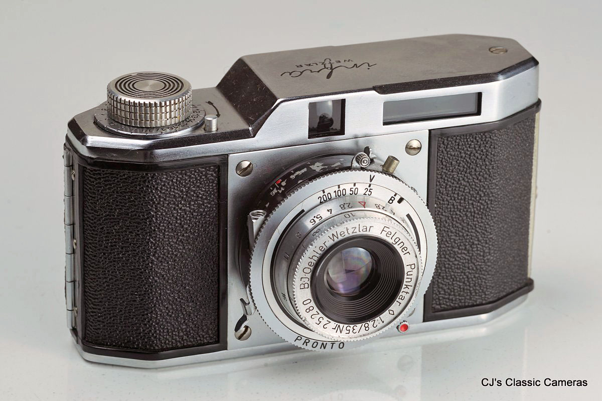 The first version had a lens that was focussed by turning the inner ring on the lens front, this is rather fiddly as the ring is quite small. The lens was a Felgner Punktar 35mm f/2.8. The shutter is a Pronto of the self-cocking type. All cameras that I have seen that have this lens have lens serial numbers between 10,107 and 11,327.