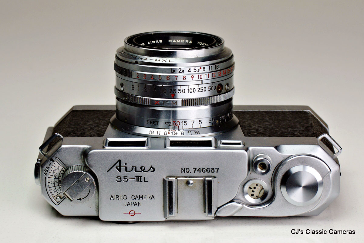 Top view of the Aires 35-III L showing a film reminder dial beneath the rewind knob, the rapid advance lever with the frame counter next to it. Also note the exposure setting ring on the lens with red LV numbers, which one had to pull back in order to select a different LV setting. Rotating the ring to select a different shutter speed would automatically adjust the continuous aperture to keep the exposure the same.