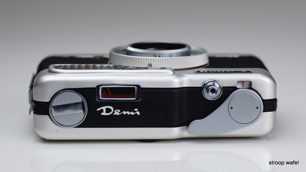 The Canon Demi was a manual camera with a limited range of shutter and aperture options, which were controlled by a single setting ring. On top of the camera was a lightmeter read out where one had to match two needles to get the correct exposure. One needle was controlled by a large selenium cell and indicated the amount of available light, the other needle was adjusted by turning the exposure ring.