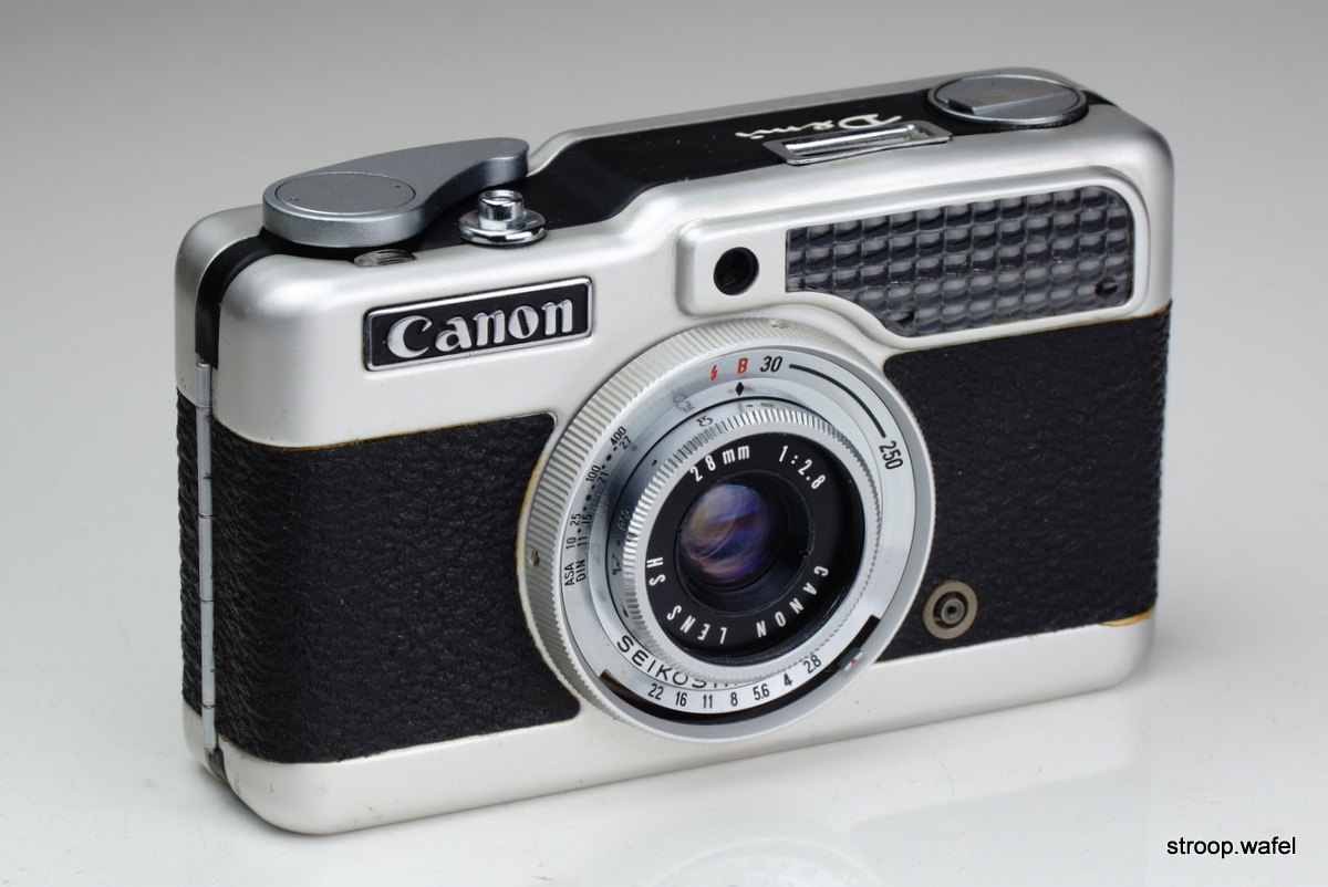 The funky-styled Canon Demi with 28mm f/2.8 lens (equivalent to 40mm on full frame) in Seikoshi shutter. Note the small round viewfinder window right above the lens, which was a Keplerian viewfinder as described below.
