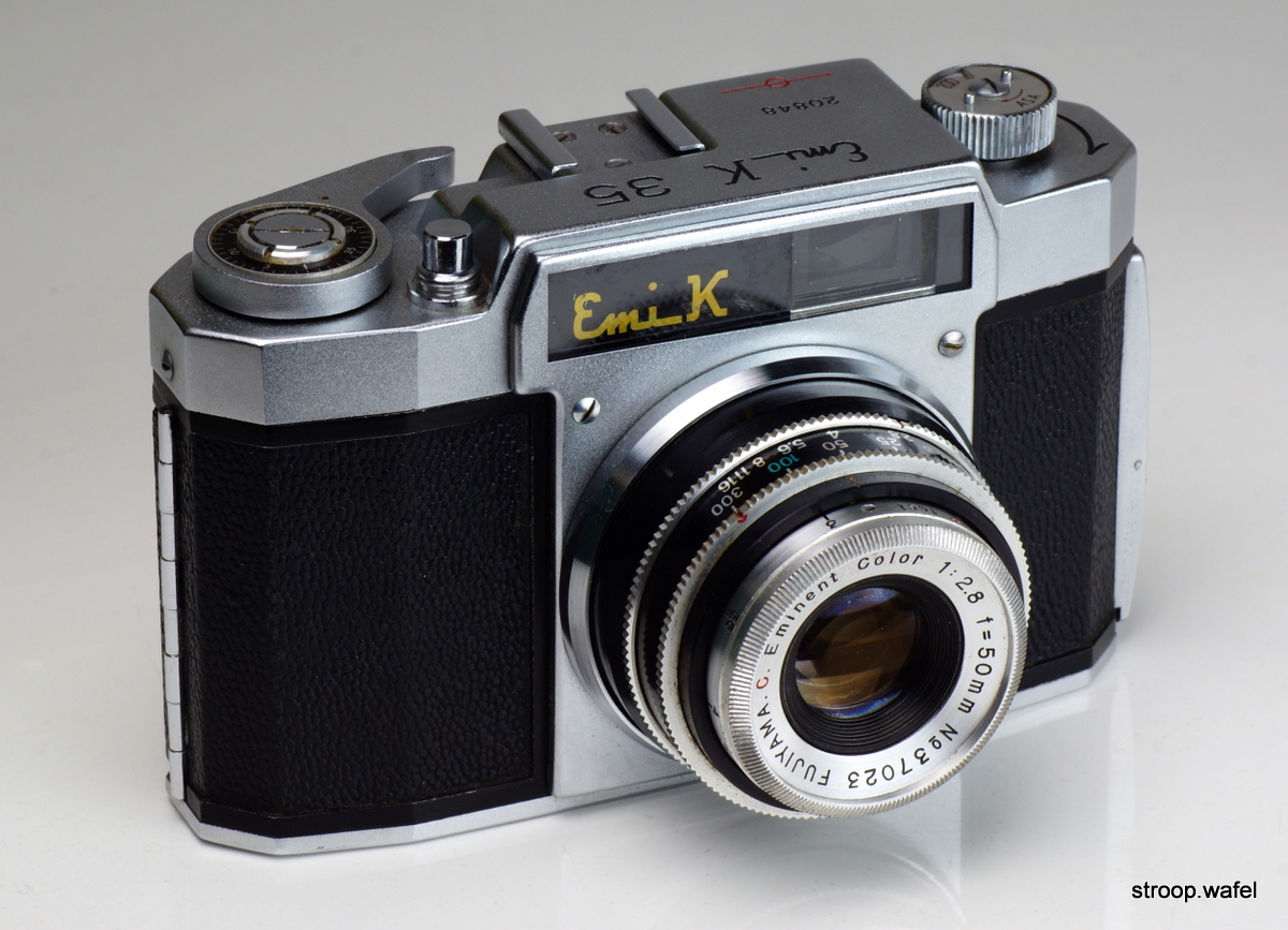 The Emi-K was produced in 1956 only by Oshiro Optical. It was a viewfinder camera with a 50mm f/2.8 Fujiyama Eminent Color lens, presumably that's why the camera was called Emi-K. It is nothing special and quite similar to other Japanese cameras from that era. Nevertheless, there is something I like about it. It was also sold as "Three C.s" and "Spinney". Very little it known about the company and also the origin of the Fujiyama lens is unclear, as the current lens maker Fujiyama says it was founded in 1975, two decades later. Oshiro also made the Hanimo 35 with selenium cell light meter.