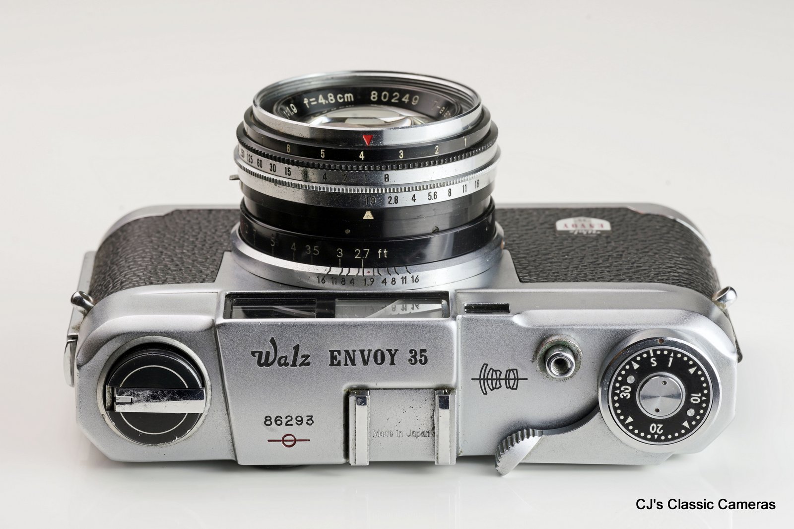 Top view of the Walz Envoy 35. Note the little optical lens diagram next to the shutter release, supporting the presence of 7 lens elements as already marked on the lens itself. It was a Sonnar style lens.