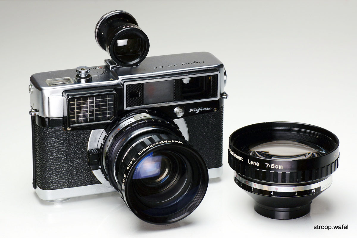 The same camera here shown with 75-150 mm f/4 telezoom and 200 mm f/4 telelens, which were relatively small, just like the camera itself.