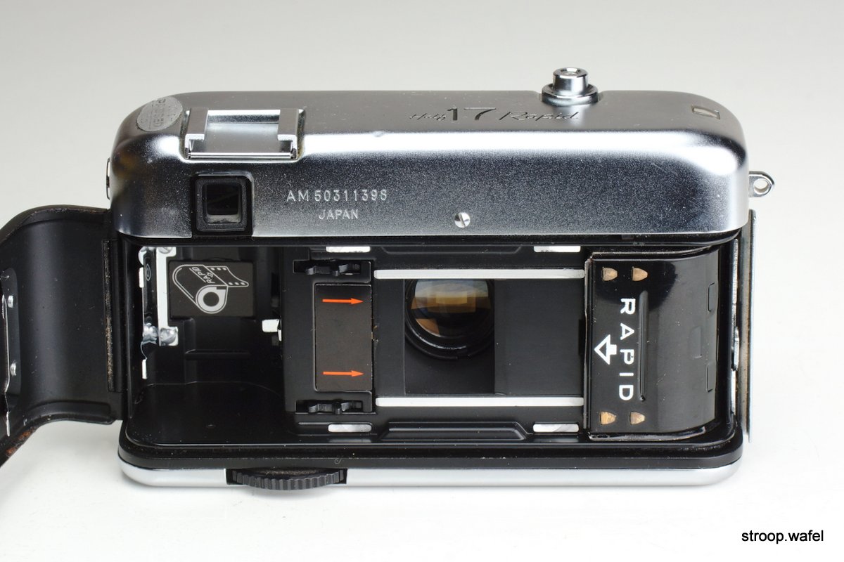Another Yashica half-frame camera was the Half 17 Rapid. It was a compact modern-looking camera with sleek lines featuring a coupled lightmeter with automatic exposure. The lightmeter cell was integrated into the lens mount. The camera sported a fast Yashinon 32mm f/1.7 lens. The camera was perhaps let down by the lack of a rangefinder, although the reduced depth-of-focus of half-frame cameras made this less of an issue than it would have been on a full frame camera with a similarly fast lens. As the name indicated, the camera used the Rapid cassette system (see Minolta Rapid 24 for details). The camera had a thumb wheel to advance the film instead of a wind lever. It was succeeded by the Half 14, which had an even faster f/1.4 lens as well as a CdS lightmeter.