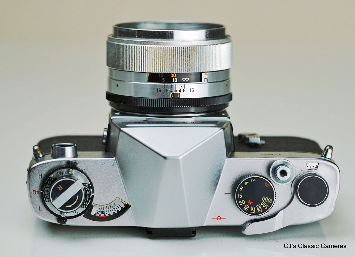 The camera had an automatic aperture priority mode, which means it selected the shutter speed based on the aperture setting, film speed and the available light as measured by a CdS meter. The camera had orange and red warning lights visible in the viewfinder as well on top of the camera. The first warned that shutter speed was too low for hand-held exposures, the second for overexposure.