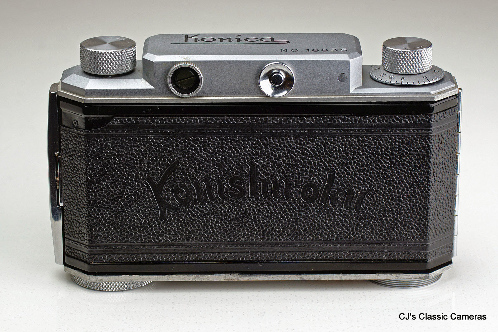 The 1947 Konica I (at the time simply known as Konica, without the I) was Konishiroku's first 35mm camera. It shared several features with early Leicas, such as the retractable (but not interchangeable) lens with helical focus, the (excellent quality) rangefinder and the wind knob with frame counter, but the similarity ends there as the Konica had a leaf shutter and a rear door that could be opened to load film. Also, the shutter release was on the shutter itself, which needed to be cocked by hand. Thus, the camera had no double-exposure prevention.