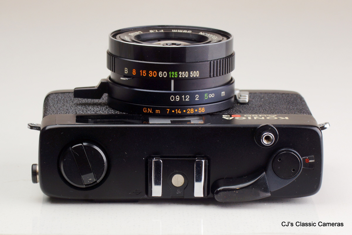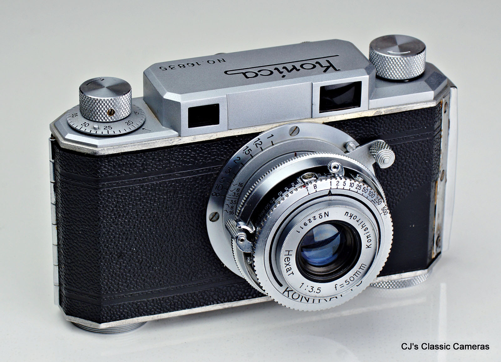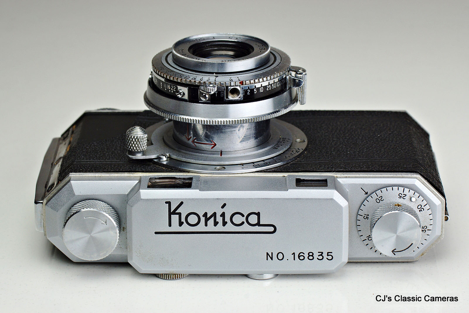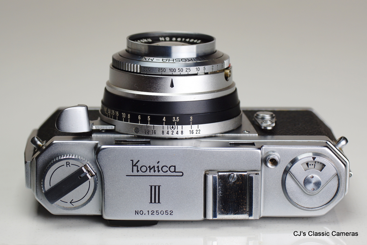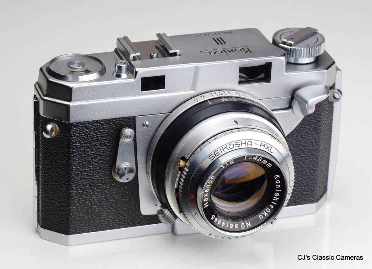 Several cosmetic variants existed, detailed on the excellent Konica I-II-III camerawiki page. The example below is a Type B as it has the name Konishiroku embossed at the back and the serial# engraved on the top housing. The lens was a 4-element Hexar, initially available with f/3.5 aperture, but later a f/2.8 version could also be had. The last version had an f/2.8 Hexanon. The shutter was a Konirapid, very similar to a Compur-Rapid, later updated to the Konirapid-S with flash synchronisation.
