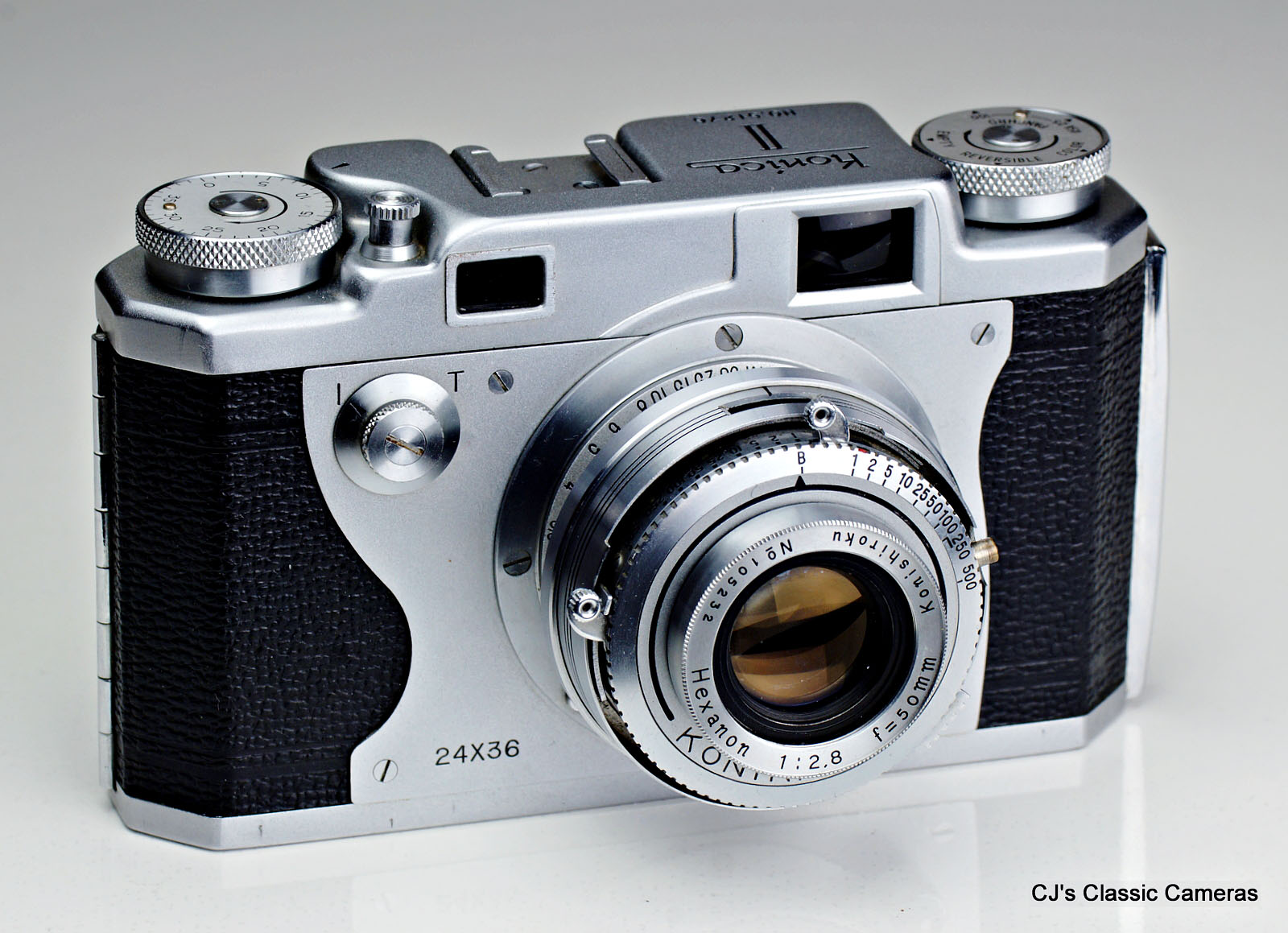 As with the Konica I, several cosmetic variants were available, including a version with Hexar lens that was missing the T knob. Early production had a Konirapid-S shutter, later replaced by Konirapid-MFX or Seikosha-MX shutters. The top model, the Konica IIA, had a six-element f/2 Hexanon lens.
