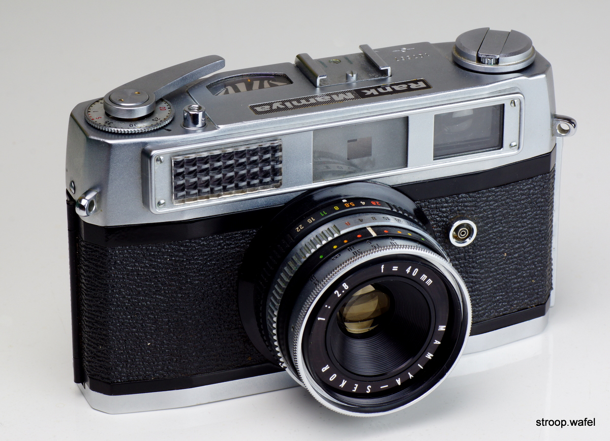 The Rank Mamiya introduced around 1963 was a cheaper version of the Mamiya Ruby. It was also known as the Mamiya 4B but was sold under the name Rank in the UK. Compared to the Ruby it had a slower and wider Mamiya-Sekor 40mm f/2.8 lens, somewhat comparable to the Minolta Uniomat but without exposure automation.