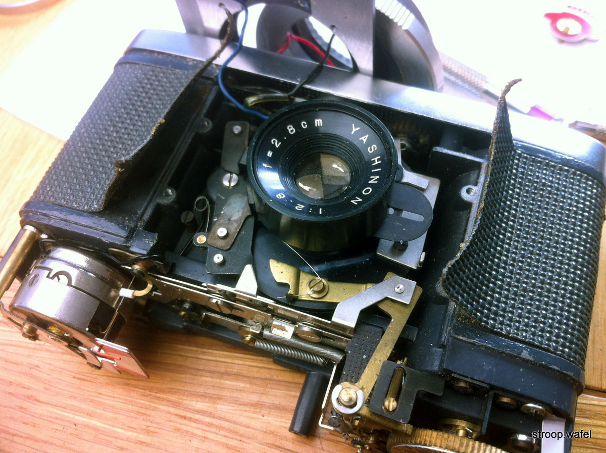 The innards of a Yashica Mimy with its front removed. The aperture is set by moving two metal slits in opposite directions to form a diamond-shaped iris, one of the slits is visible just to the right of the lens. On this example the two slits had stuck together, probably due to lack of use, but after loosening them up this little Mimy was once again working as it should.