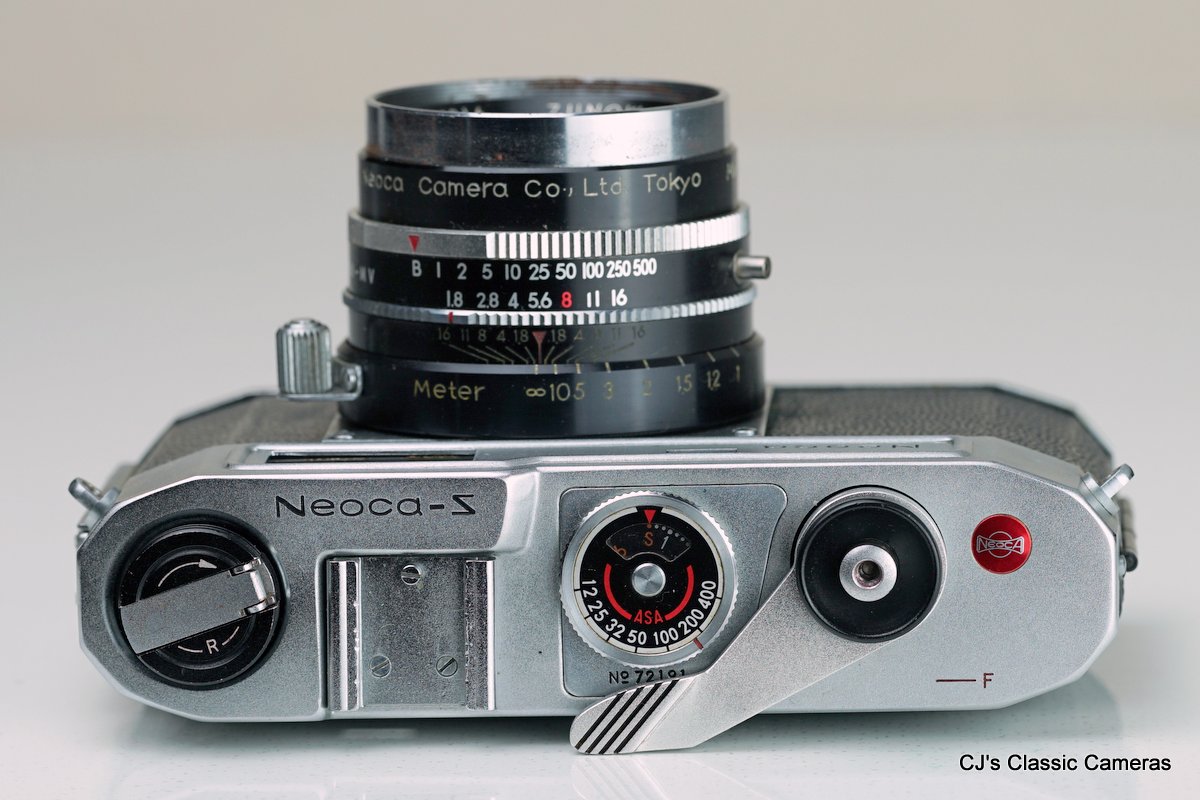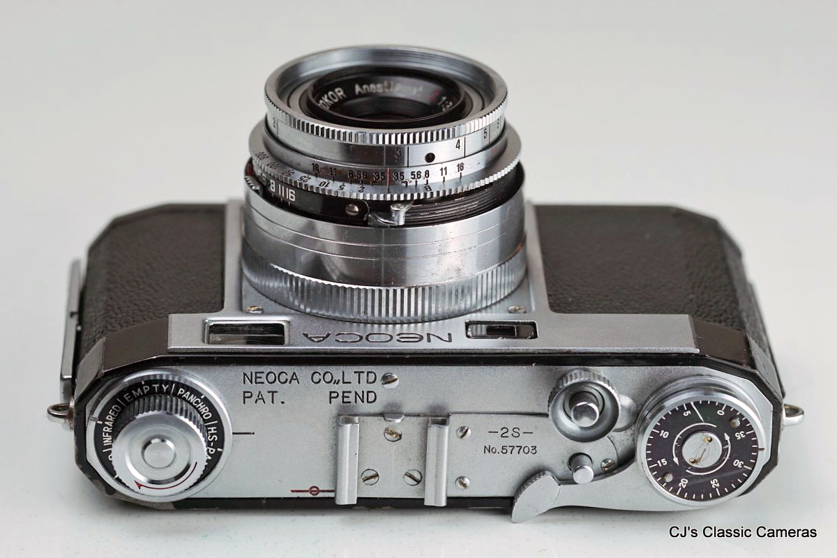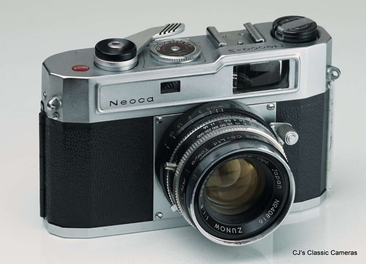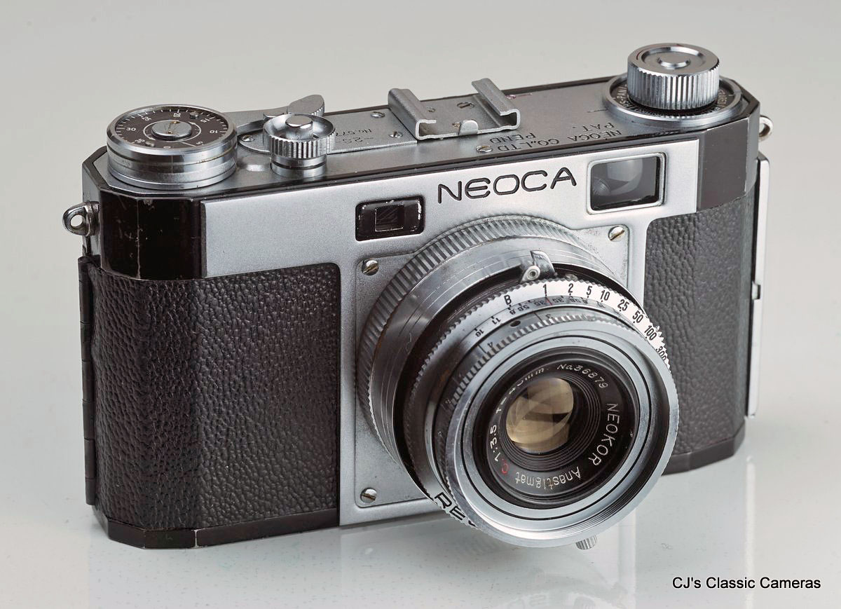 Neoca was a small Japanese camera maker starting initially under the name Mizuho (see above), but from 1954 it started to make 35mm cameras under the name Neoca. The early models had a characteristic metal front plate with rectangular range and viewfinder windows, perhaps in an attempt to make it look like the Nikon rangefinders. The Neoca 2S below was one of these. A particular feature was that it was a double-stroke camera. but it did have the advantage that it cocked the shutter automatically. The lens had a very close focus range of 0.5 m. Rather unusual also was that the shutter was located behind the lens.