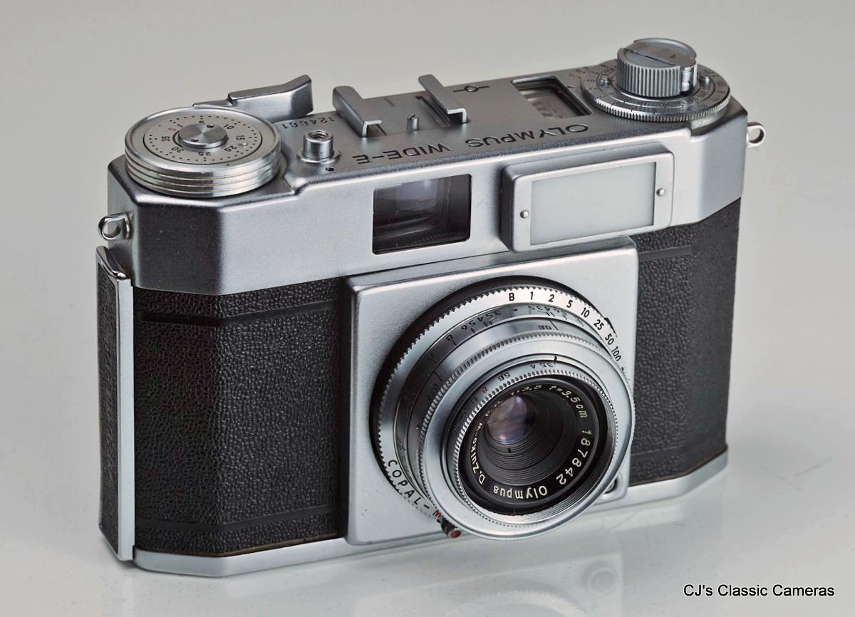 The first Olympus Wide model had a wind knob and lacked a lightmeter, but the Wide-E shown below had a rapid wind lever as well as a selenium cell. A desirable version with faster f/2.0 lens instead of the f/3.5 lens on the other models was called the Wide-S, but it lacked the lightmeter.
