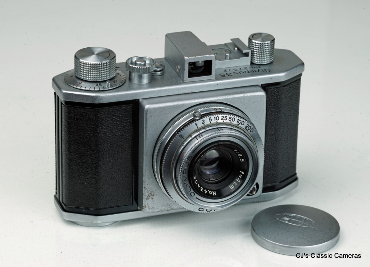 The first Olympus 35mm camera was the Olympus 35; the variant shown here is the model IV, the first variant where the shutter release and cocking mechanisms were internal to the body, making the camera look cleaner than earlier models, which had external linkages.