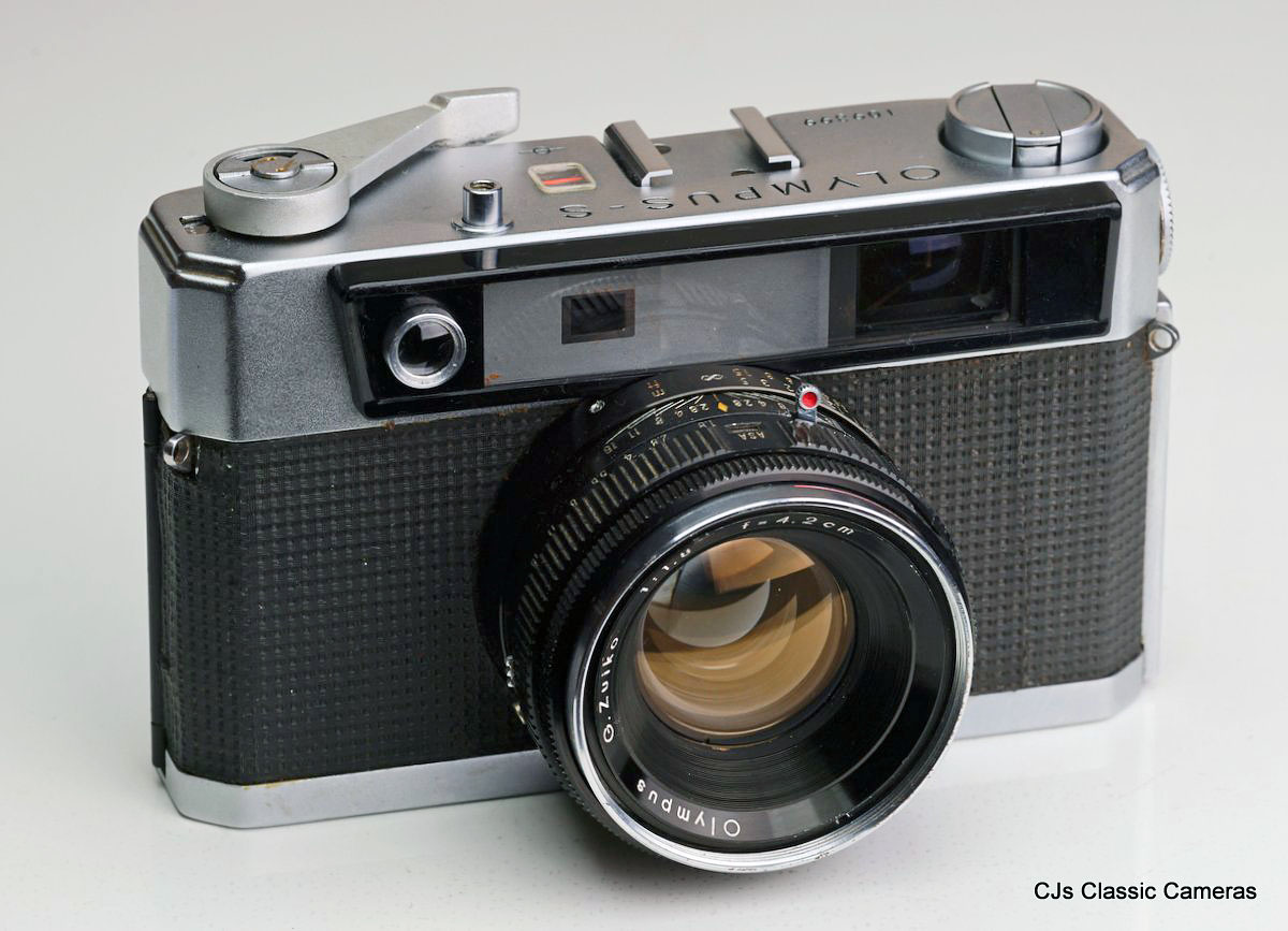 Although probably better known for its Pen range and the OM SLR range (see below), Olympus did produce several impressive full-frame 35mm compact cameras, including the Olympus-S and 35 SP (see below for the latter). The Olympus-S was quite similar to contemporary Japanese rangefinders such as the Minolta AL or the Konica S. The original version was marked 'Electro Set' and had a selenium cell lightmeter, but this was soon replaced with a smaller and more reliable CdS cell. It most impressive feature was probably its seven element f/1.8 lens Zuiko lens with a relatively short 42 mm focal length.