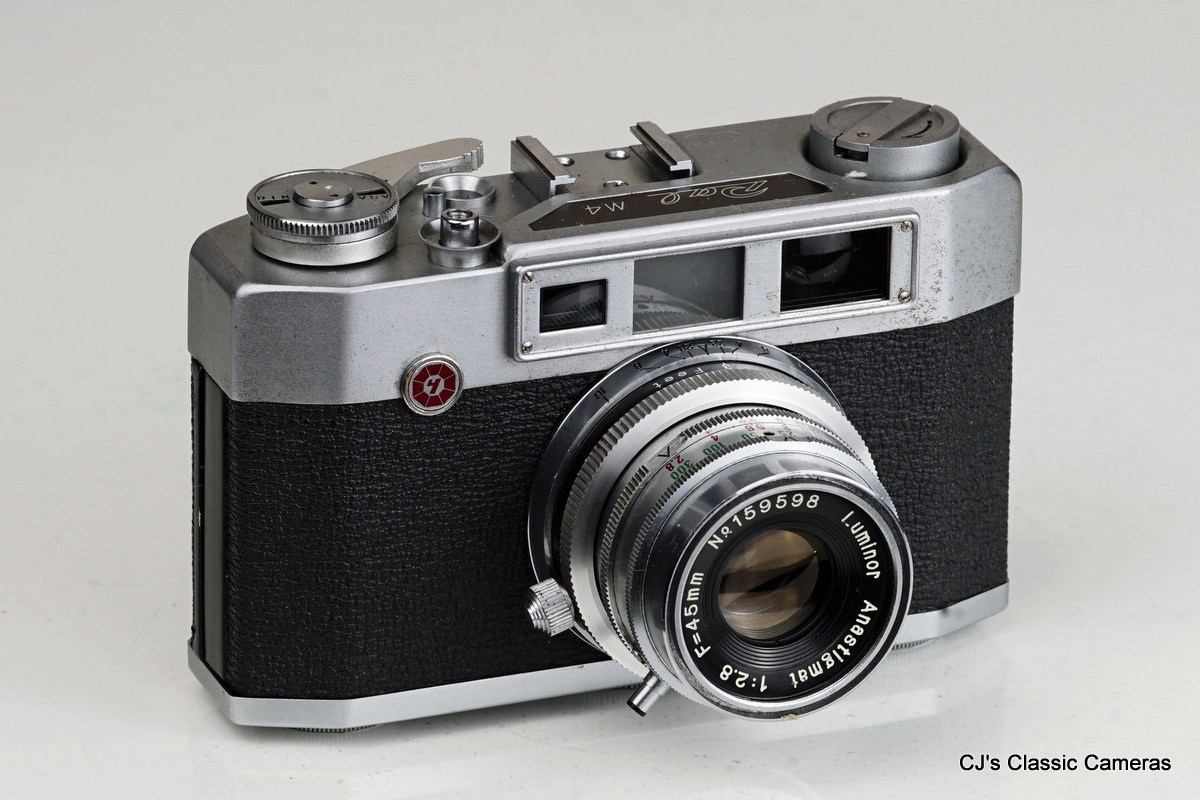 A Pal M4 with Luminor Anastigmat 45mm f/2.8 lens in unspecified leaf shutter. The camera feels quite similar to that of the Halina 35 (small but heavy), which at least in the UK is more commonly found.